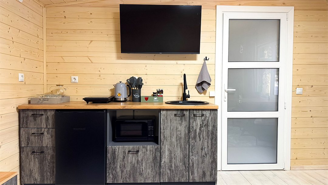 Wi-Fi, фен, плита для приготовления пищи, микроволновая печь, обогреватель, ванная комната, душевая кабина, водонагреватель, банные полотенца, тапочки, двуспальная кровать, стулья, шкаф для одежды, вешалки, обеденный стол, унитаз, раковина, туалетные средства, диван-кровать, раскладной диван, мини-холодильник, телевизор со Smart TV, вид на лес, мыло, затемняющая штораВ домике