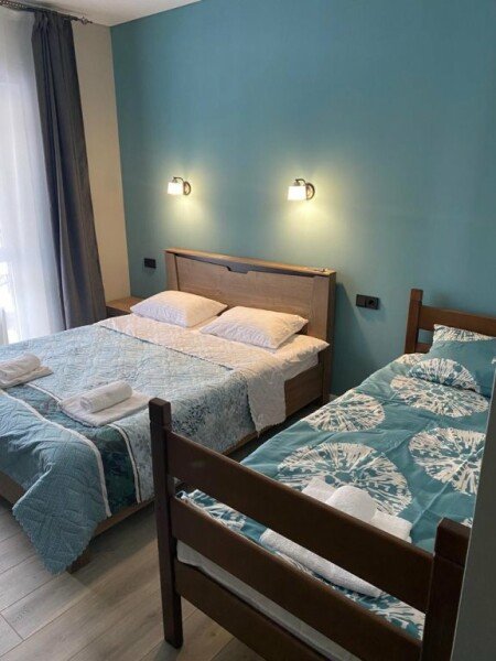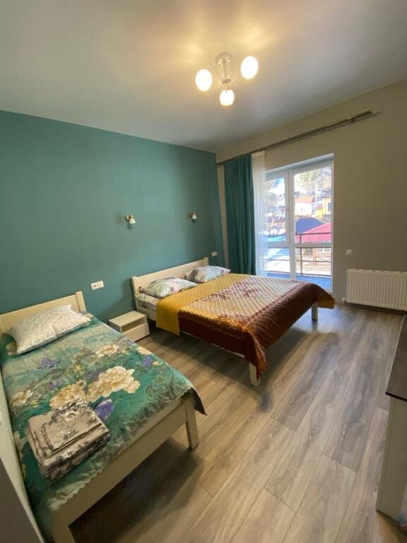 В данном номере представлены односпальная кровать и двуспальная кровать для удобного отдыха.