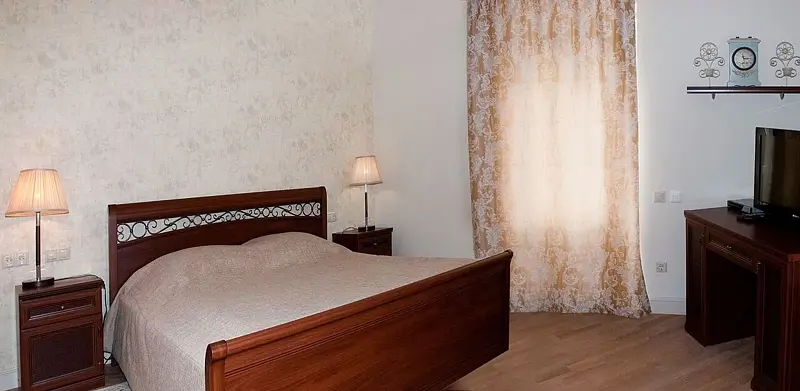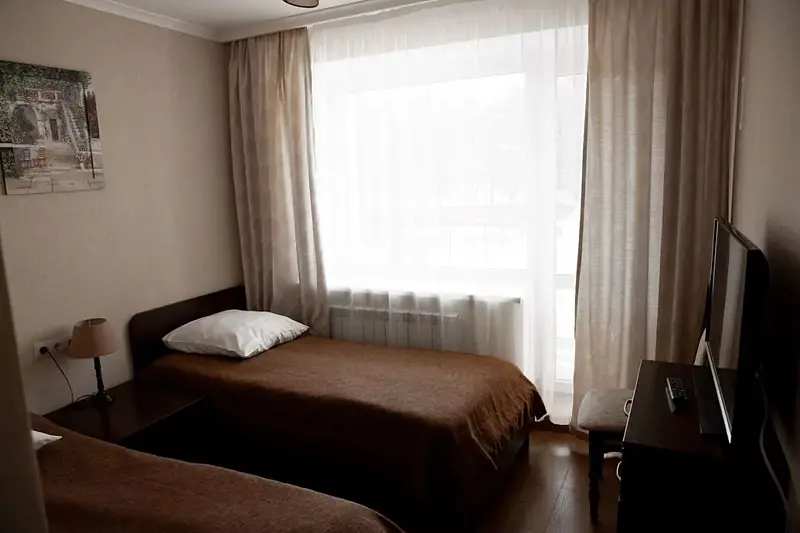 Трехэтажное здание пансионата построено в альпийском стиле по индивидуальному проекту и может разместить до 65 человек. В распоряжении гостей номера различных категорий: эконом, стандарт, стандарт плюс, полулюкс и люкс, каждый из которых оснащён всеми необходимыми удобствами.