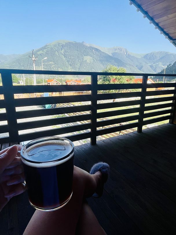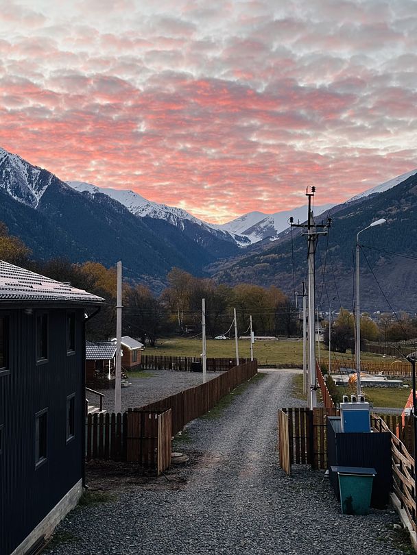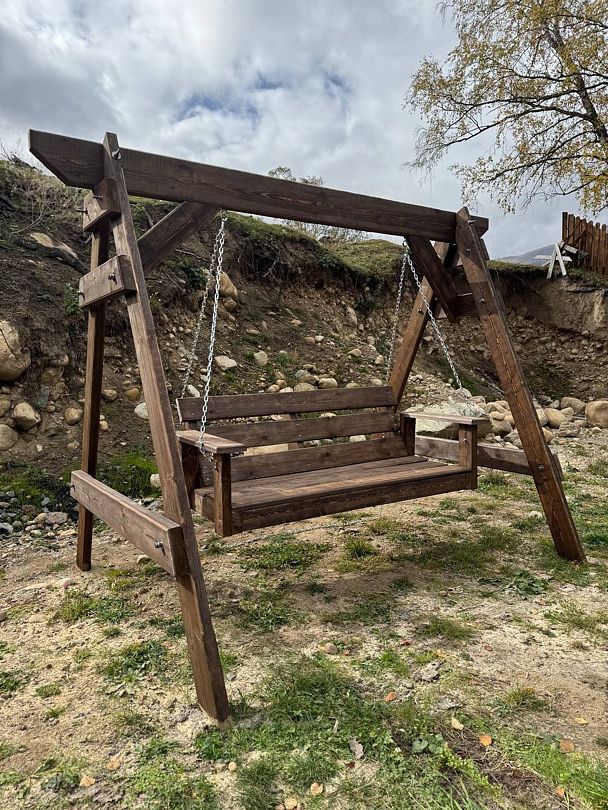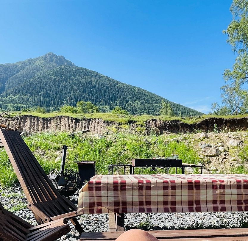 В пятистах метрах протекает горная река, за рекой расположена гора с пешими тропами, подъем на нее занимает 40–50 минут, в итоге вы получаете красивейшие виды на горы Домбая и Теберды. Панораму вы можете рассматривать, качаясь на качелях, и записывать видео.