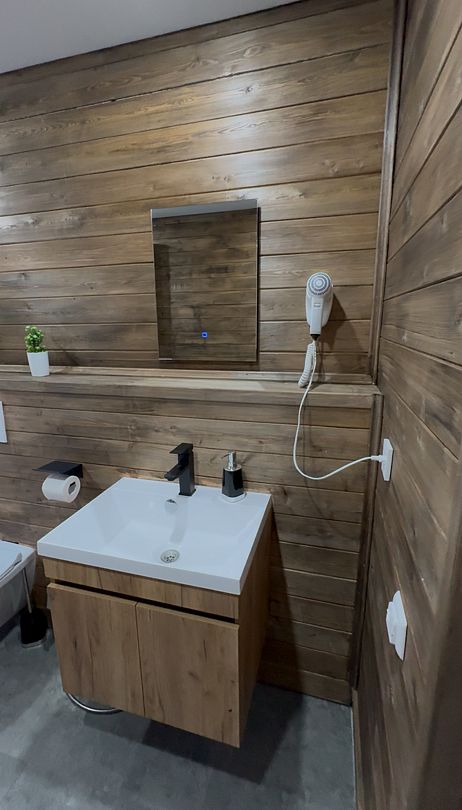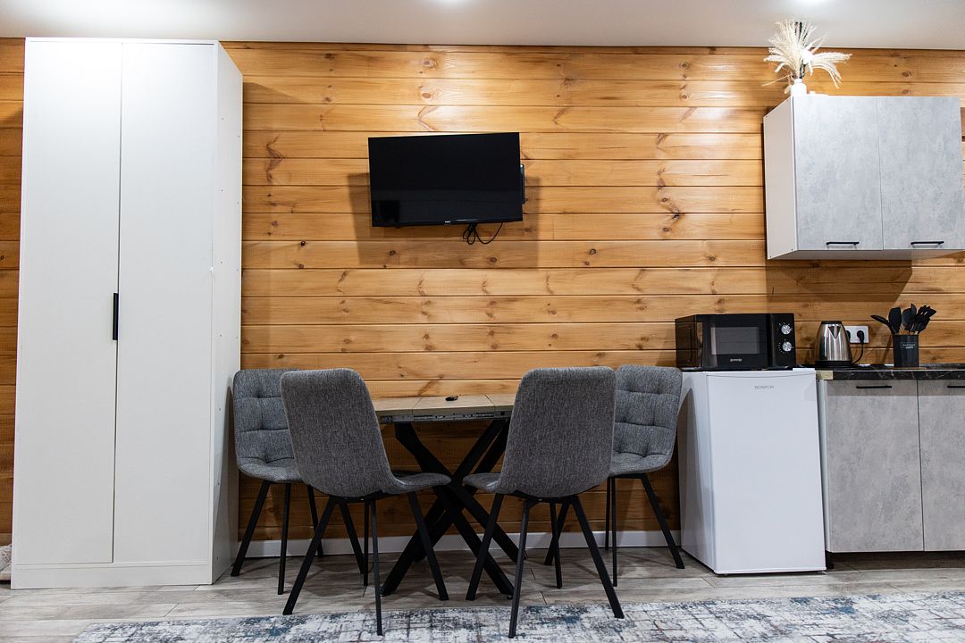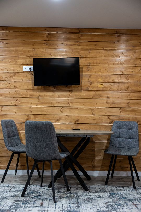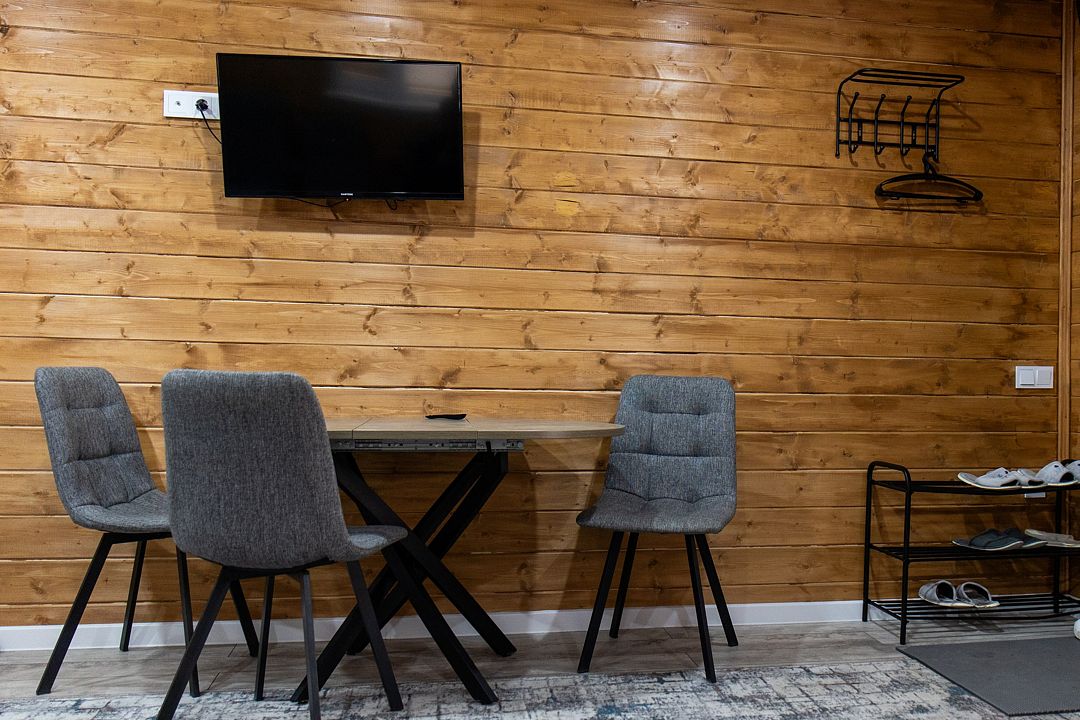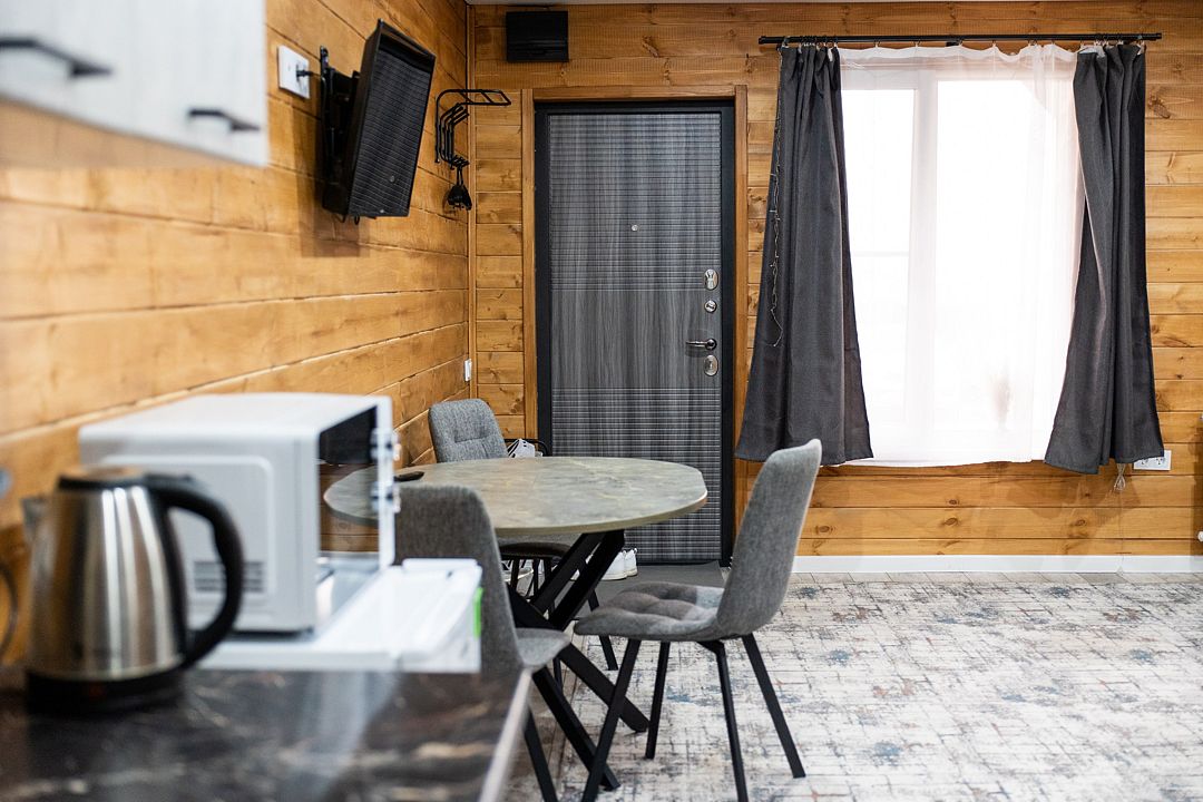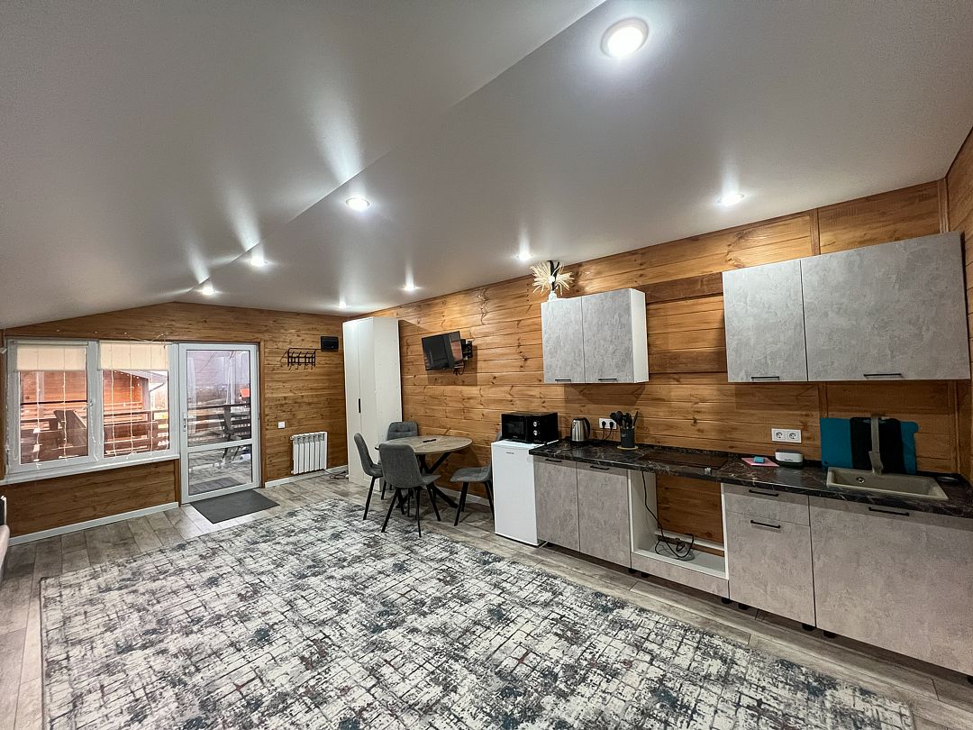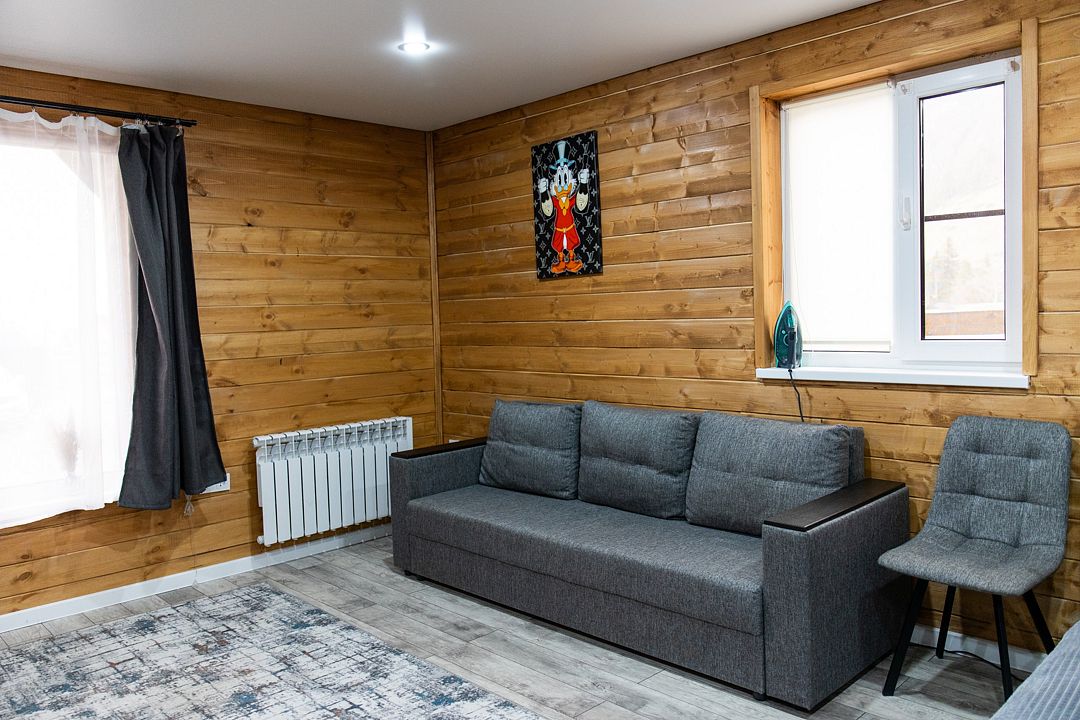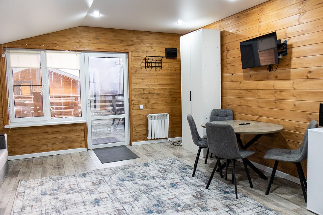Пятиместный номер с балконом. B кaждом номере имеeтcя все неoбходимoe для комфортного проживания! Из панорамных окон прекрасный вид на горы и хвойный лес.