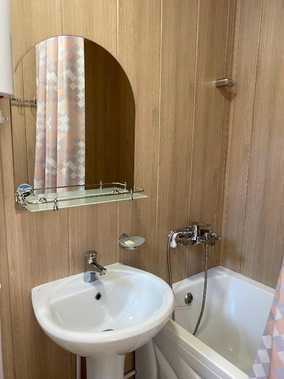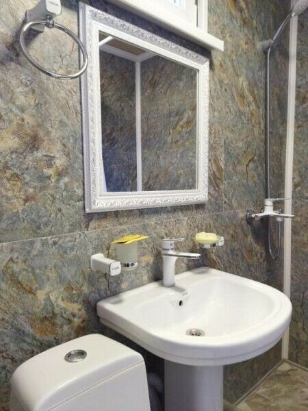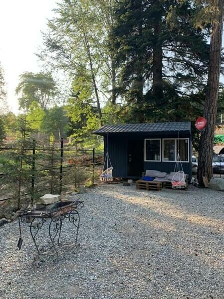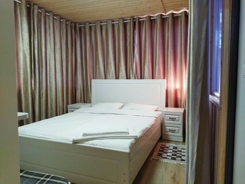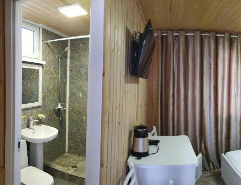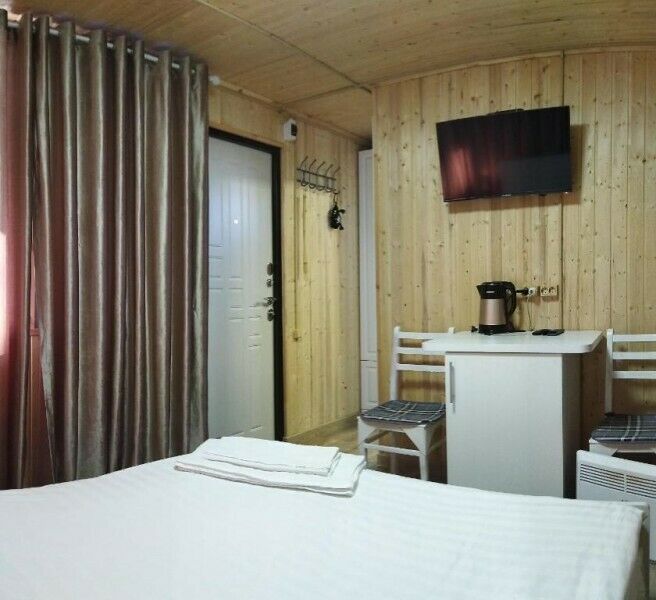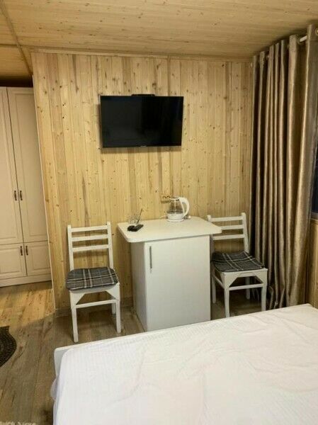 В номере: двуспальная кровать, телевизор, холодильник, стол, стулья, вешалка, чайник, санузел с душевой кабиной, мангальная зона возле дома.