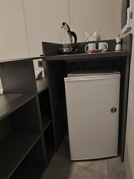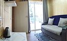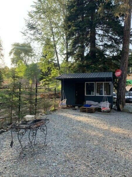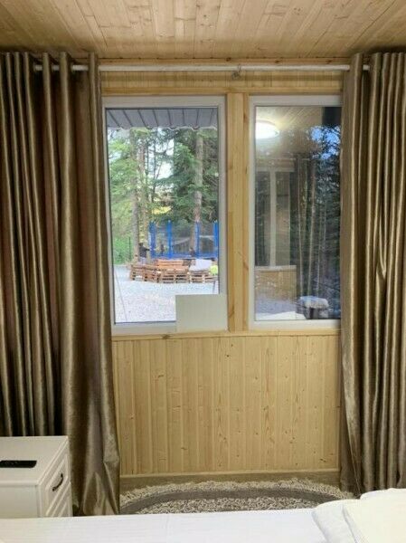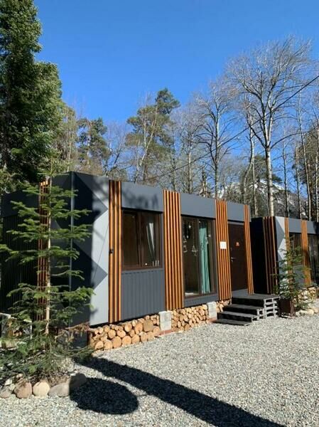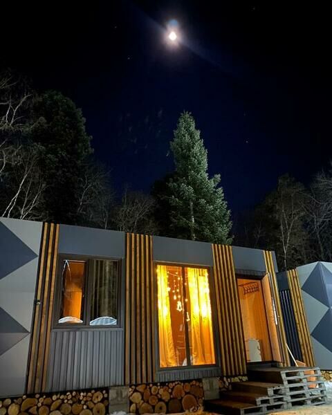 Тини-хауз расположен в лесной зоне, минимизируя визуальные и акустические раздражители. Умный дом с панорамным остеклением и мни террасой у входа. Внутри тини-хауса лаконичный комфорт: коммуникации (регулируемое электричество, горячая/холодная вода, теплые полы, электроштора, микроклимат, электрозамок, чайник, холодильник, санузел с ванной, фен, комплектация). Площадь номера 18-20 кв.м., возможно размещение 2х человека (2х спальная кровать 160Х200 или 2 две кровати 80Х200)