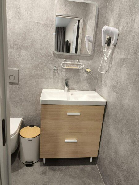 В ванной комнате: фен, комплект полотенец, косметический набор (мыло, гель, шампунь).
