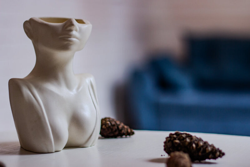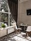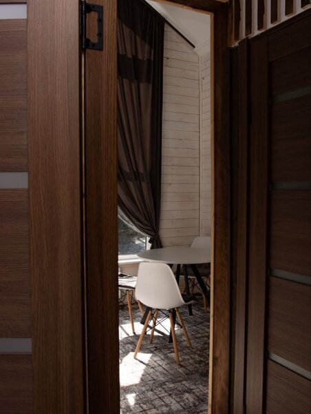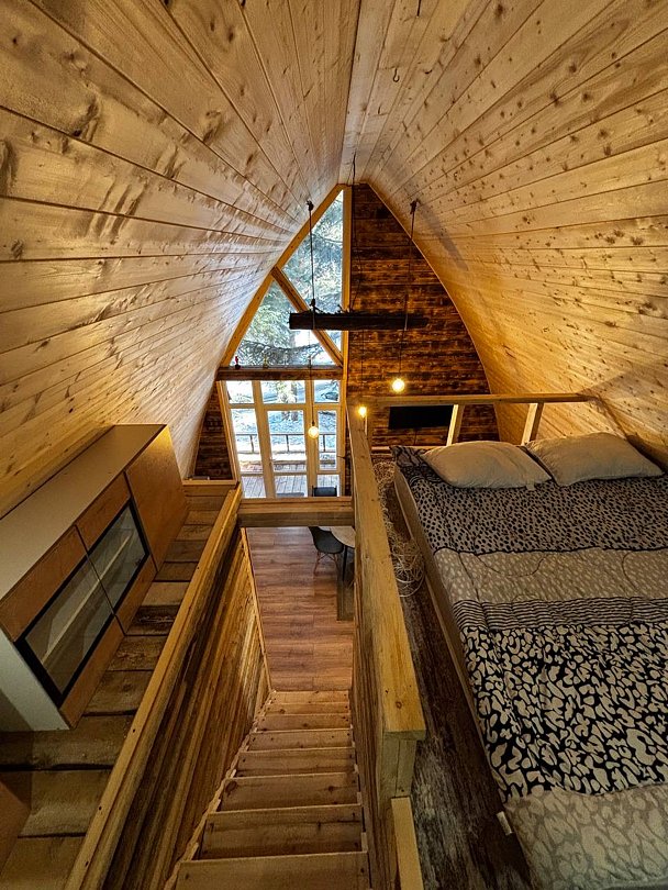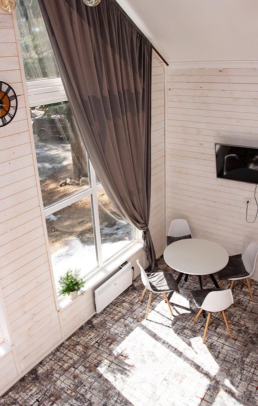 Отдельная спальня, кухня и гостевая зона с большим панорамным окном на первом этаже и отдельная спальня на втором этаже.