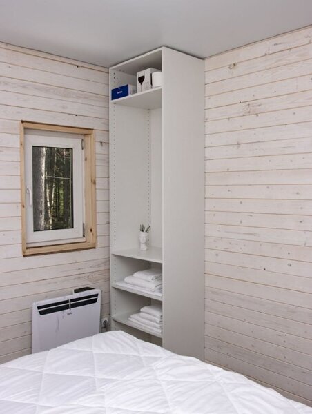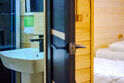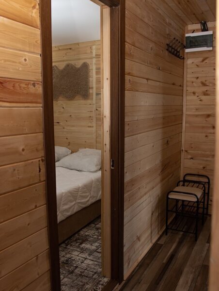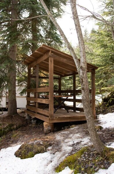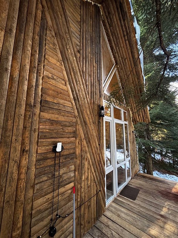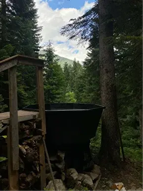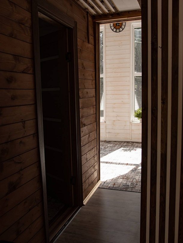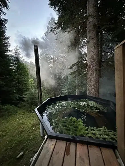 Банный комплекс включает в себя банный чан и бaню-бoчку с предбанником из которого открывается вид на хвойный лес.