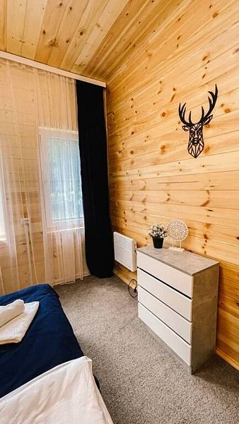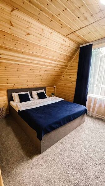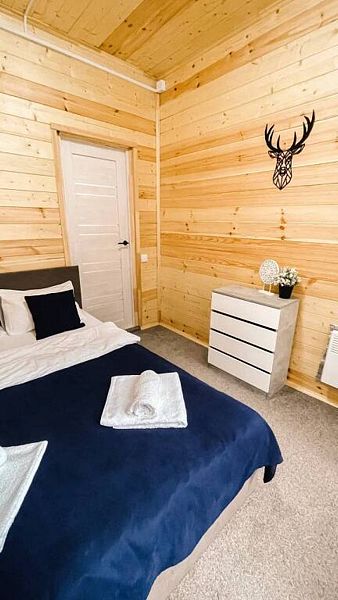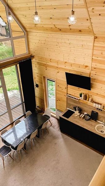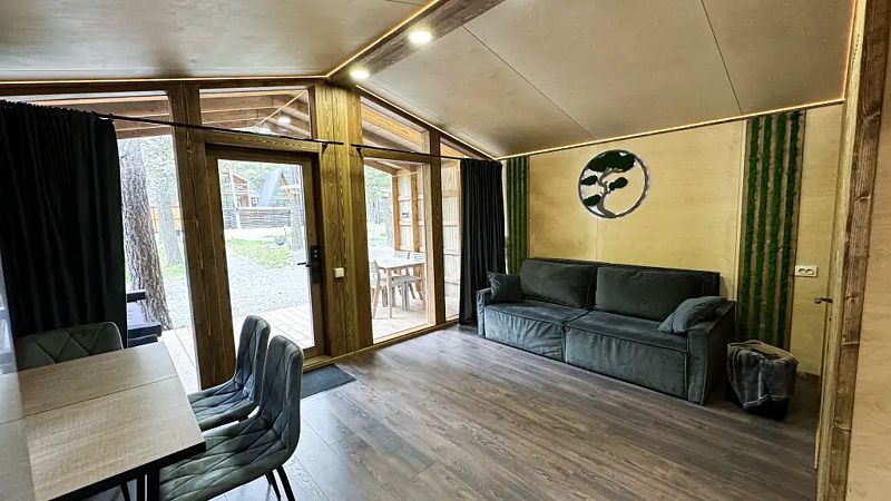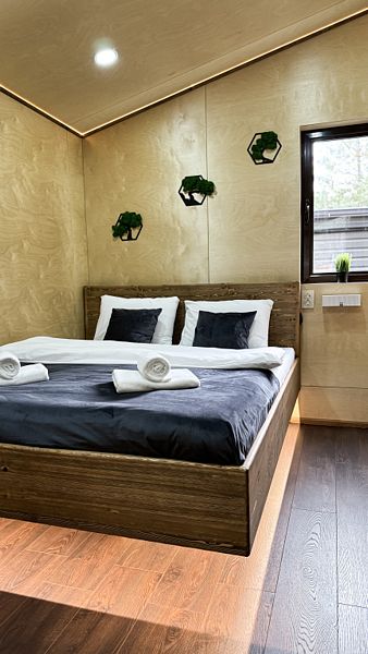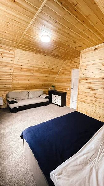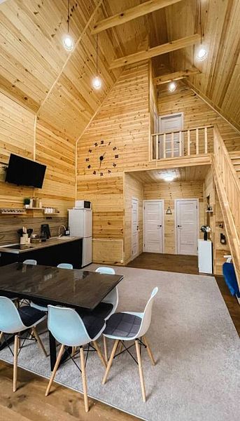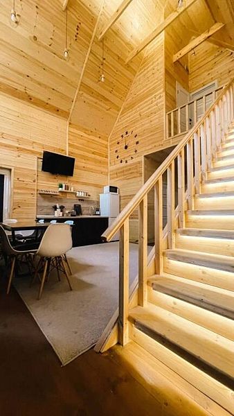 BarnHouse — просторный коттедж в скандинавском стиле с двумя этажами, тремя комнатами, двумя санузлами и просторным холлом со вторым светом. Вместимость дома — до 8 человек.