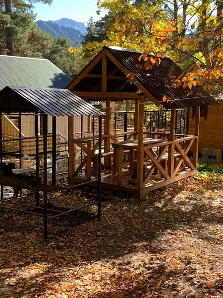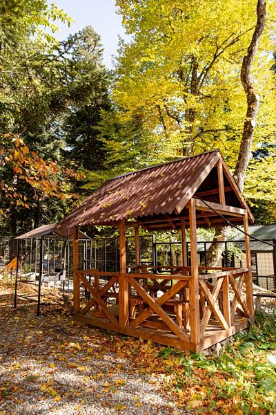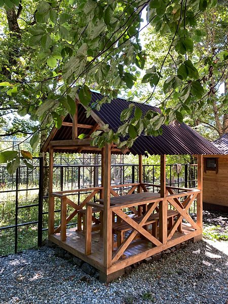 На краю леса, за каждым домиком, находятся комфортные беседки — настоящая находка для любителей отдыха на свежем воздухе. Здесь вы сможете расслабиться и восхититься красотой природы, наслаждаясь уединением и спокойствием в уютной обстановке.