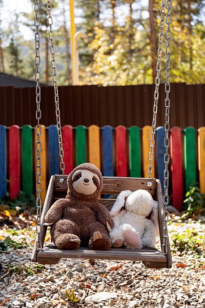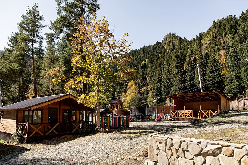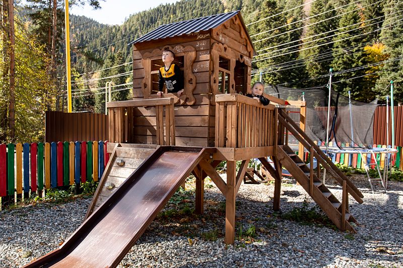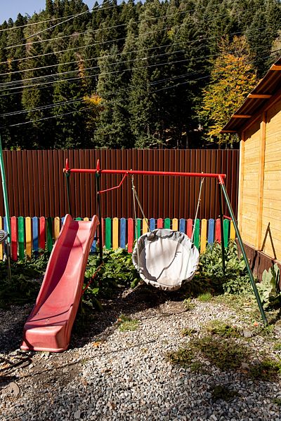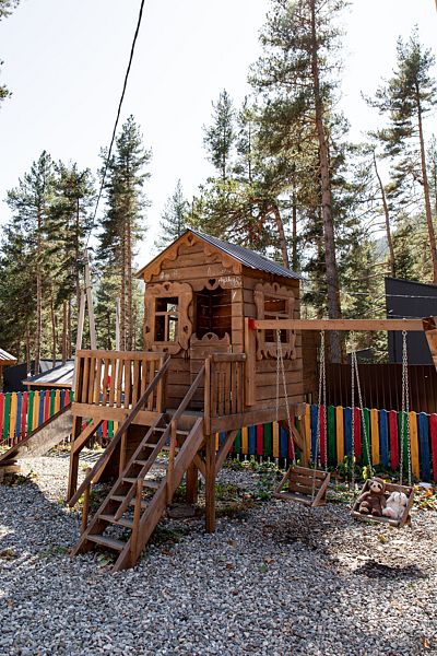 Для семей с детьми предусмотрена огражденная детская площадка с горками, качелями и батутом. Здесь дети смогут весело проводить время и создавать незабываемые моменты на свежем воздухе, а родители — насладиться уединением и красотой окружающей природы.