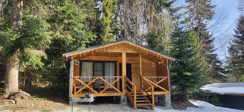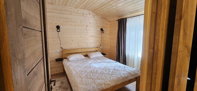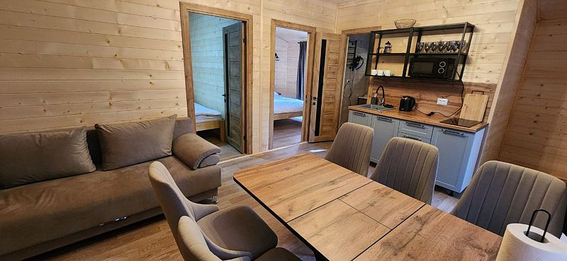 Шале одноэтажное 45 кв. Две раздельные спальни. В одной спальне двухспальная кровать, в другой две односпальные. Гостиная с раскладным диваном. 4 основных и 2 доп места в качестве раскладного дивана. Один санузел.