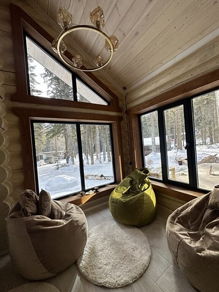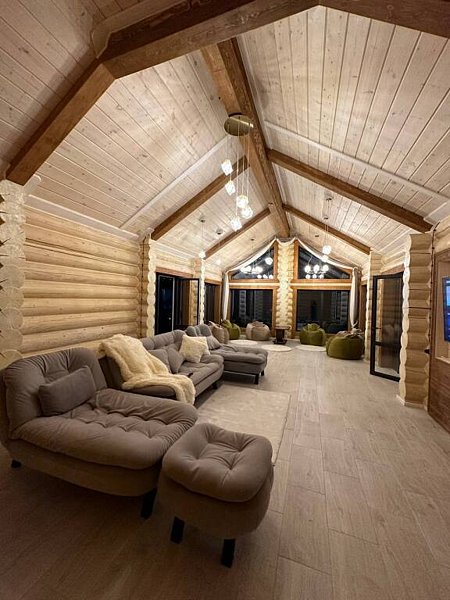 Банный комплекс с панорамными окнами в сауне и хаммаме. Дизайнерский интерьер и много приятных мелочей. Большая гостиная и просторная комната отдыха.