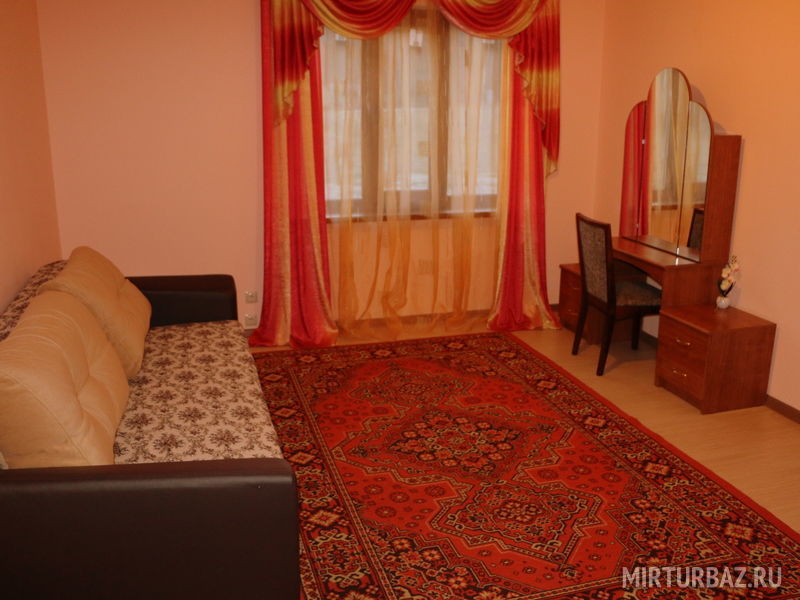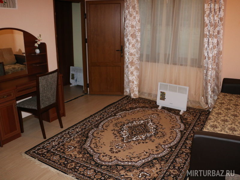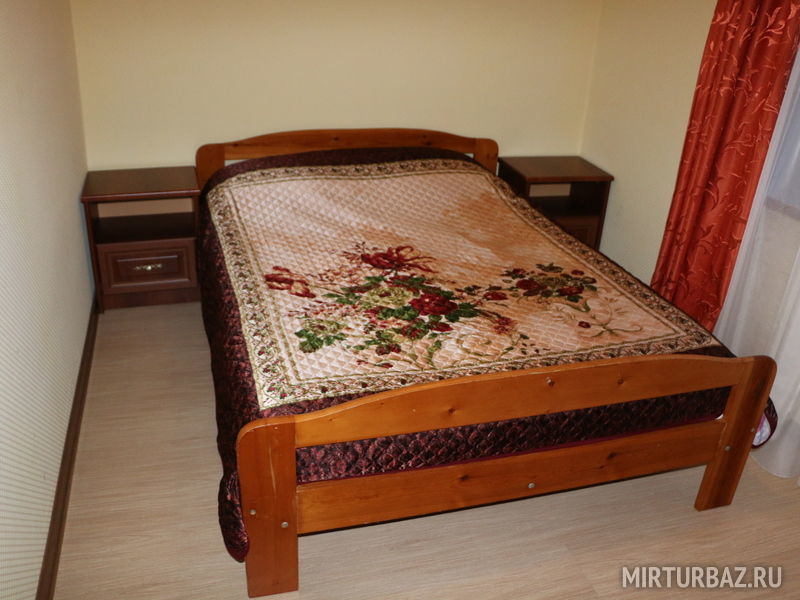 Двухкомнатные четырехместные номера с удобствами. В номере двуспальная кровать, раскладывающийся диван, шкаф, прикроватные тумбы.