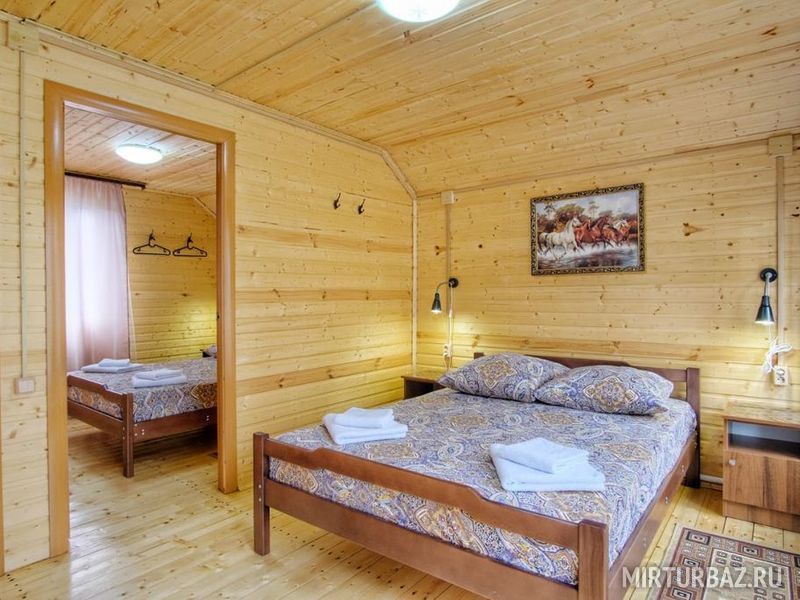 Двухкомнатный дом с холлом-кухней. Две двуспальные кровати, двуспальный диван, телевизор, холодильник, фен, санузел.