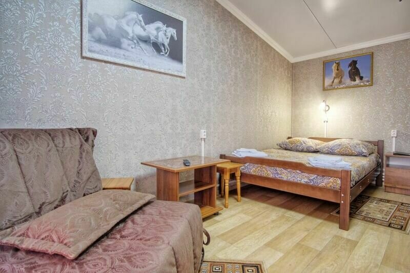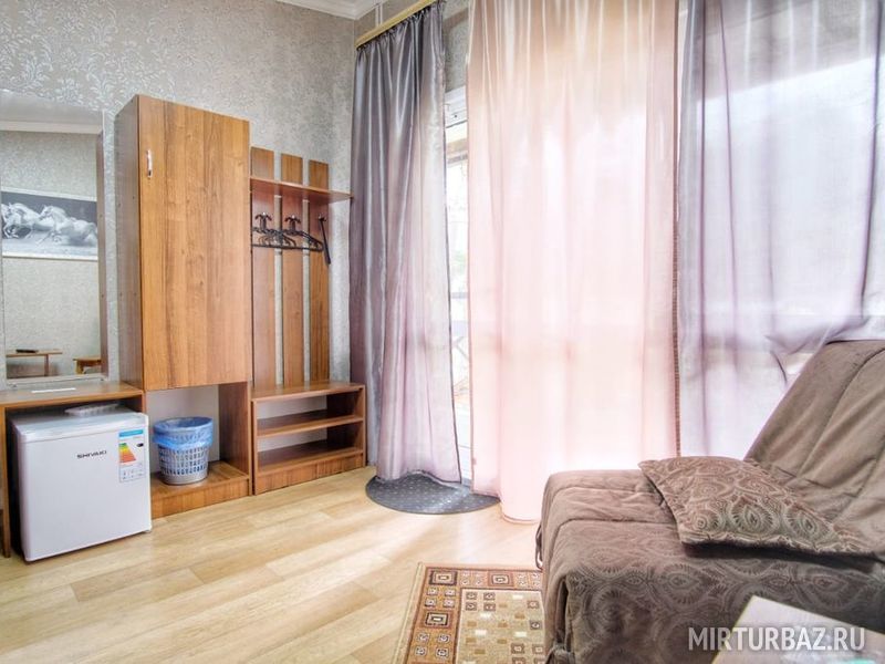 В номере двуспальная кровать, кресло-кровать,телевизор, холодильник, фен, санузел.