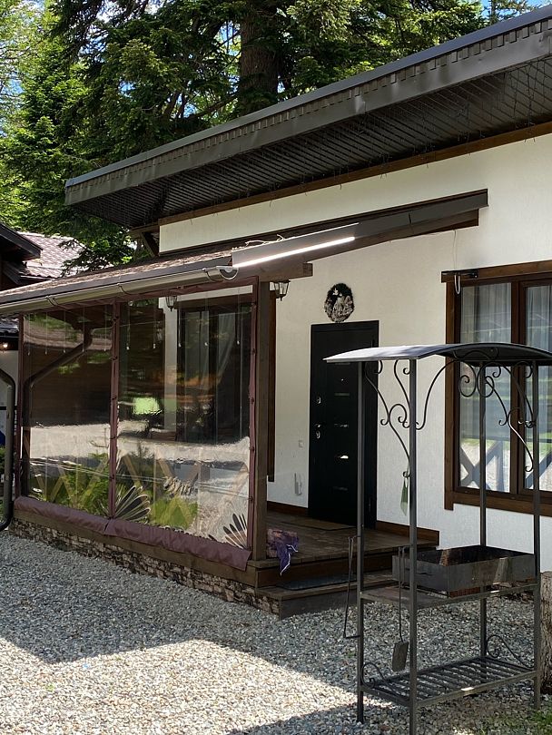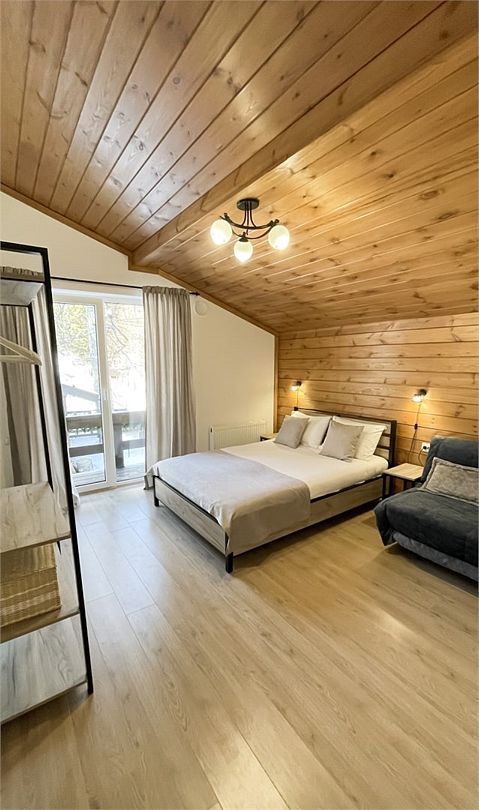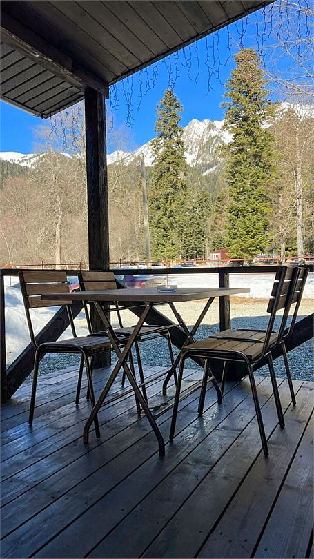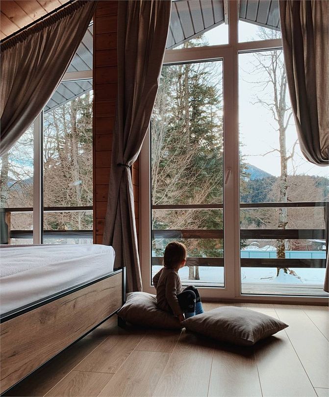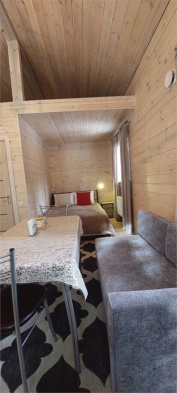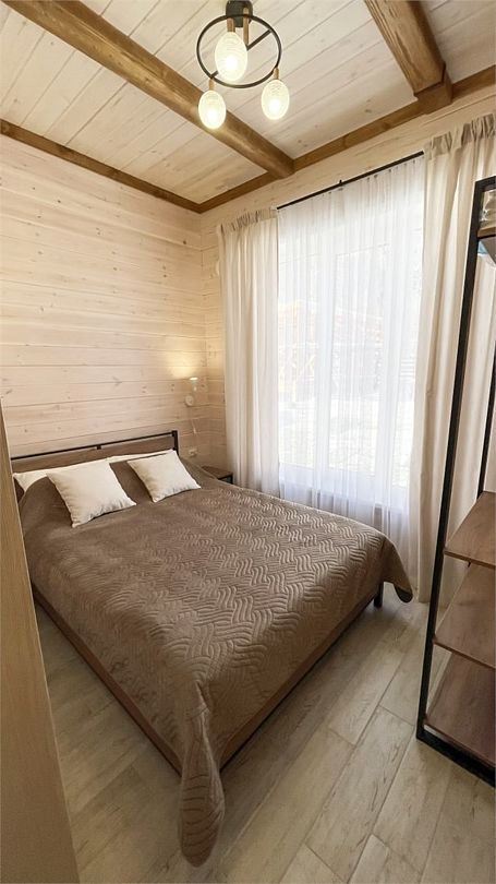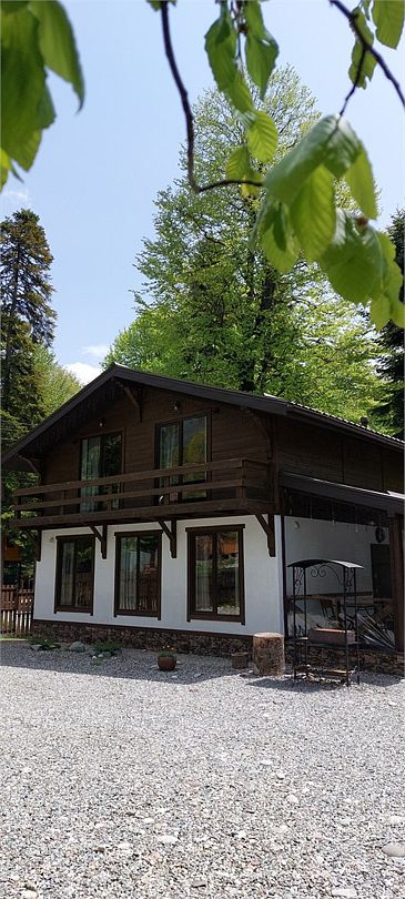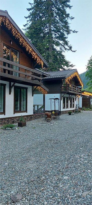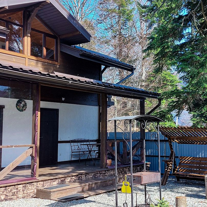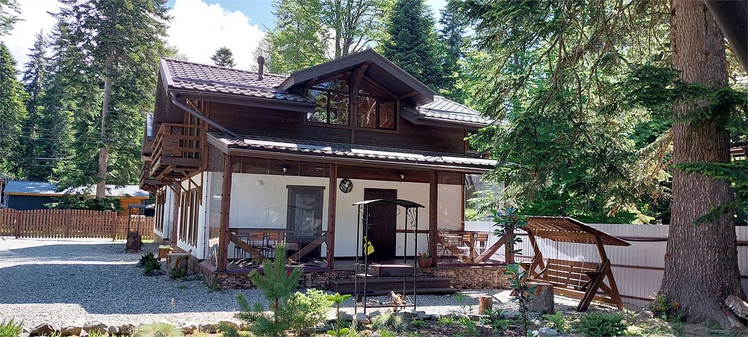 Большой и уютный домик в стиле шале, рассчитан на размещение до десяти человек, со всеми необходимыми условиями для комфортного отдыха. В доме три спальни с панорамным видом и выходом на балкон.