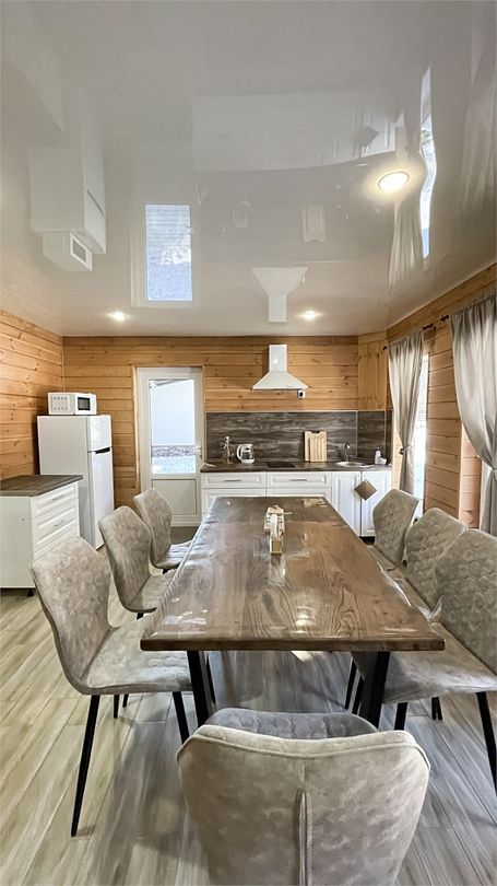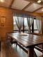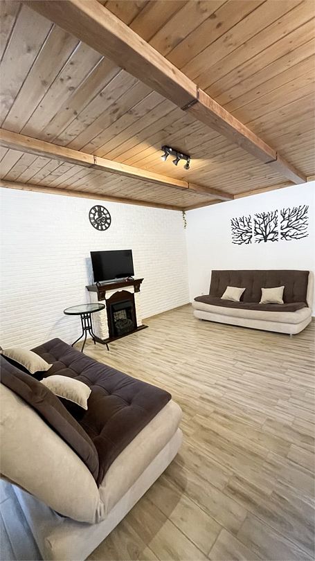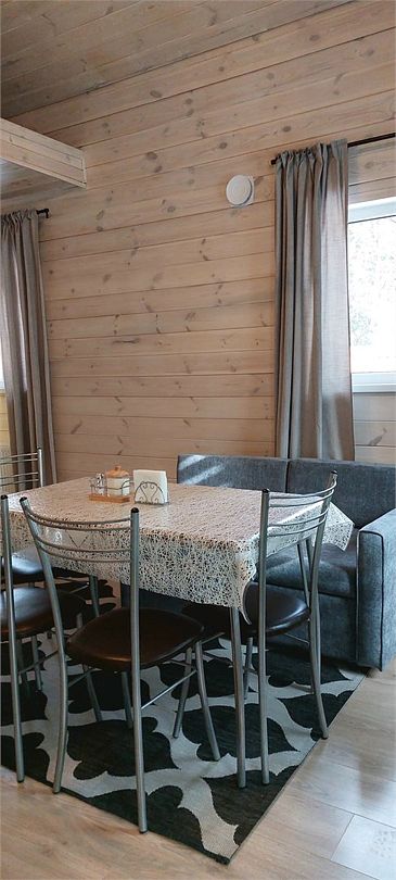 На первом этаже расположены: гостиная с камином, кухонной зоной, большим столом и двумя раскладными диванами; санузел с душевой; комната для сушки вещей. При доме находится терраса с садовой мебелью, рядом мангальная зона.