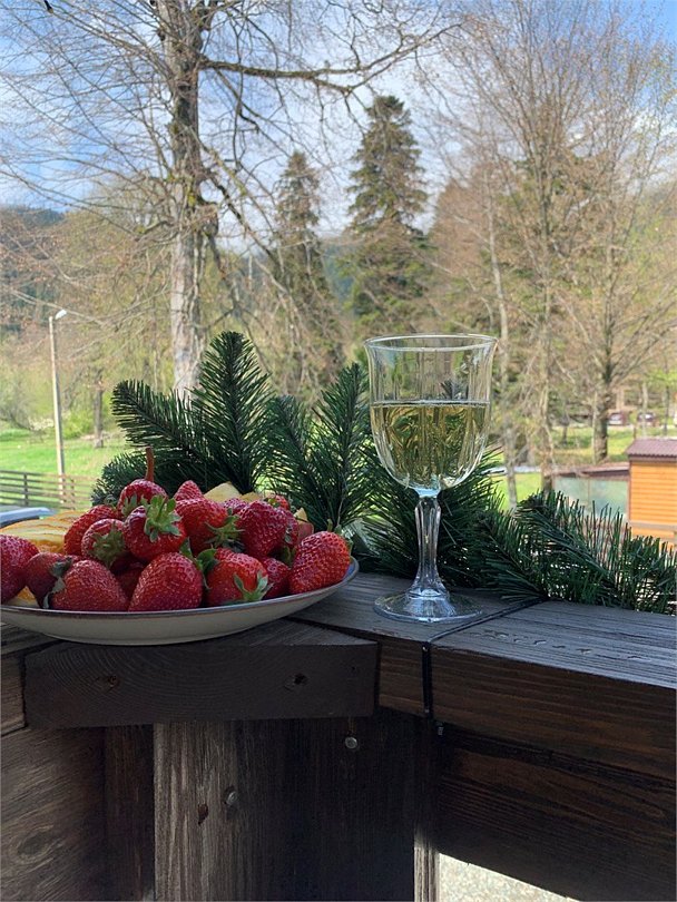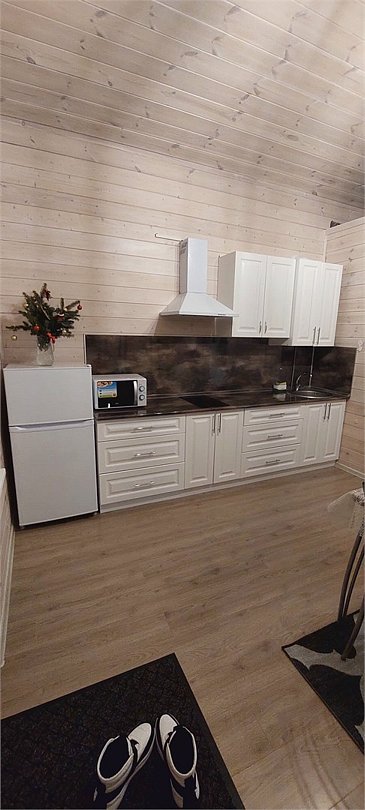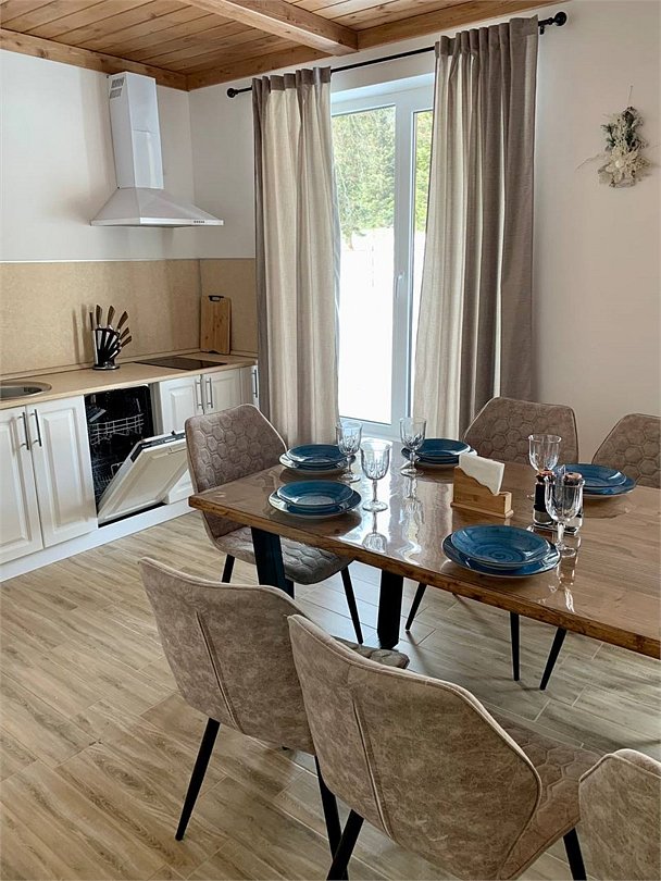 Кухня оснащена всем необходимым для приготовления пищи. При доме находится терраса с садовой мебелью, рядом мангальная зона. Территория шале закрыта, перед домом имеется парковка.