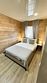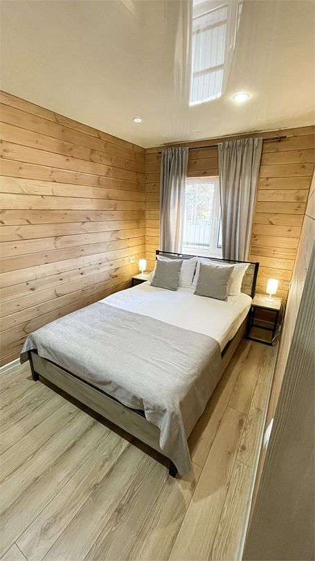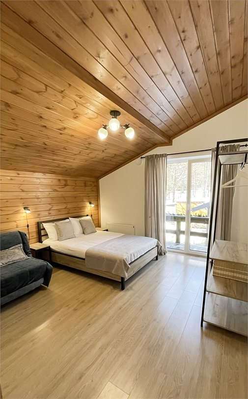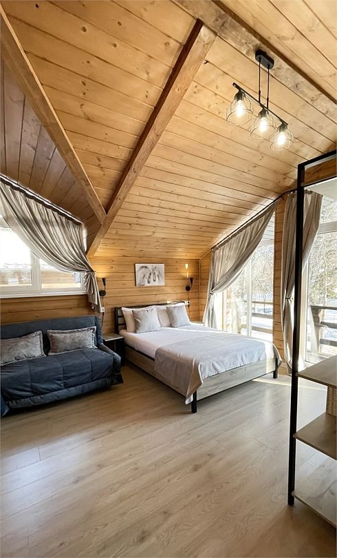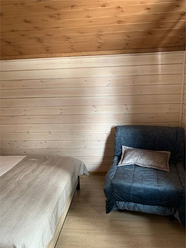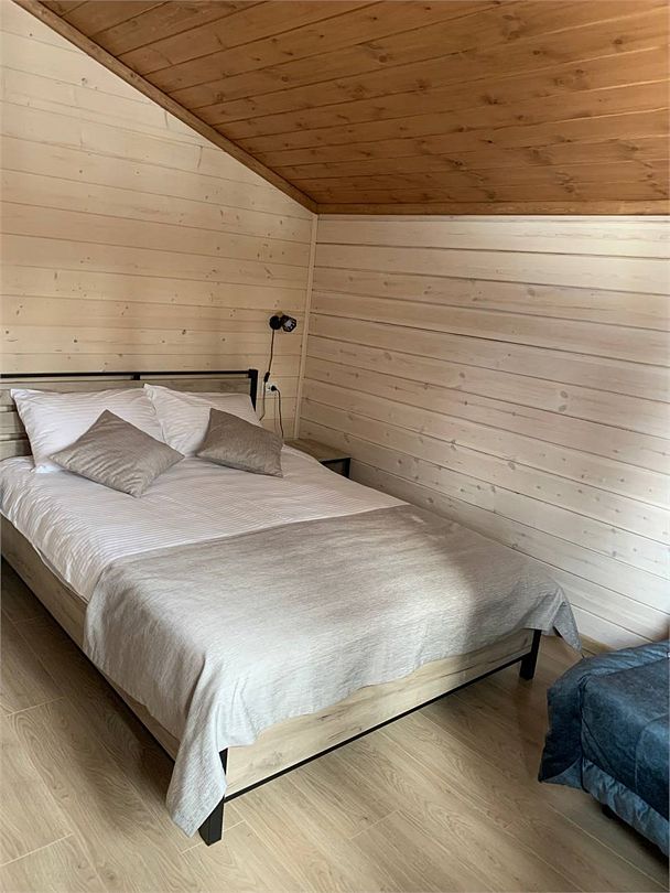 На втором этаже расположены три спальни, санузел и душевая. В двух спальнях находятся двуспальная кровать и раскладной диван (ширина дивана сто двадцать сантиметров), в одной — двуспальная кровать и раскладное кресло.