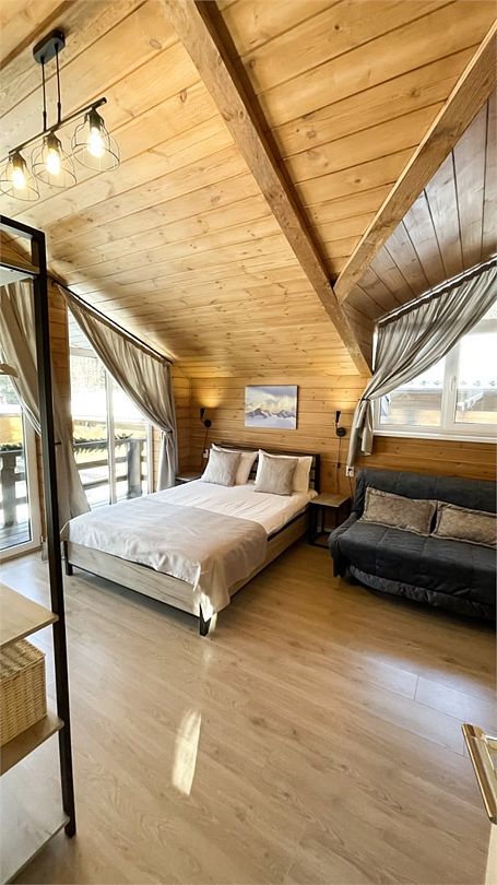 Большой и уютный домик в стиле шале рассчитан на размещение до двенадцати человек, со всеми необходимыми условиями для комфортного отдыха. В доме три спальни с панорамным видом и выходом на балкон.