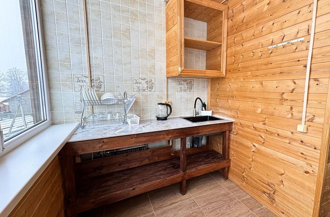 Полноценная кухонная зона с холодильником, микроволновкой, электрочайником и всей необходимой посудой на этаже.