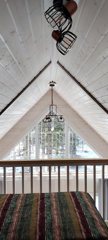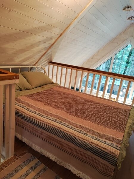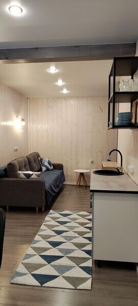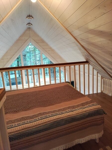 В доме просторная кухня-гостиная с двуспальным диваном, антресоль с двуспальной кроватью.