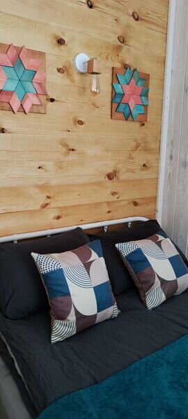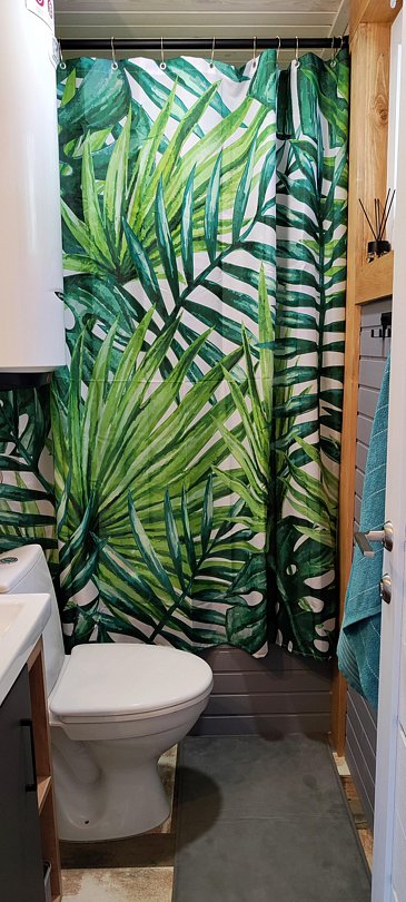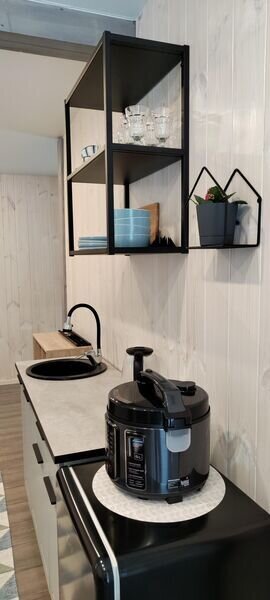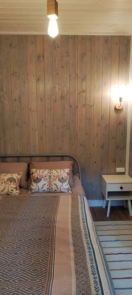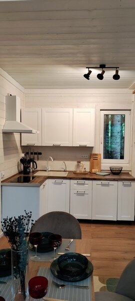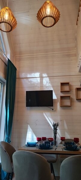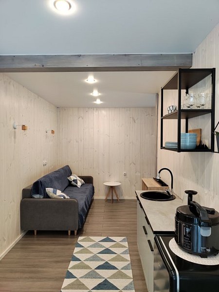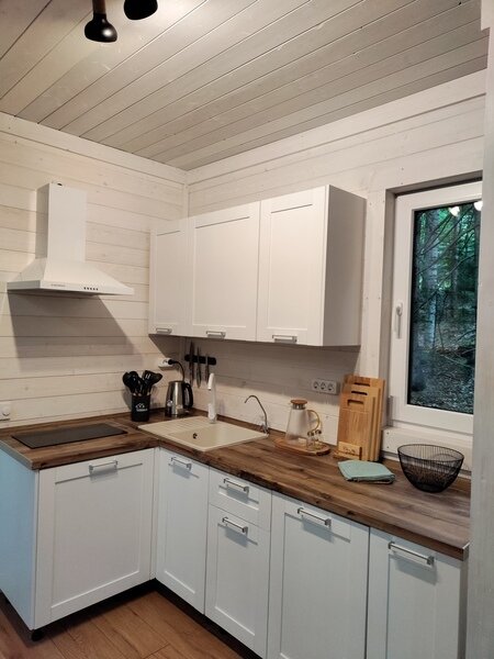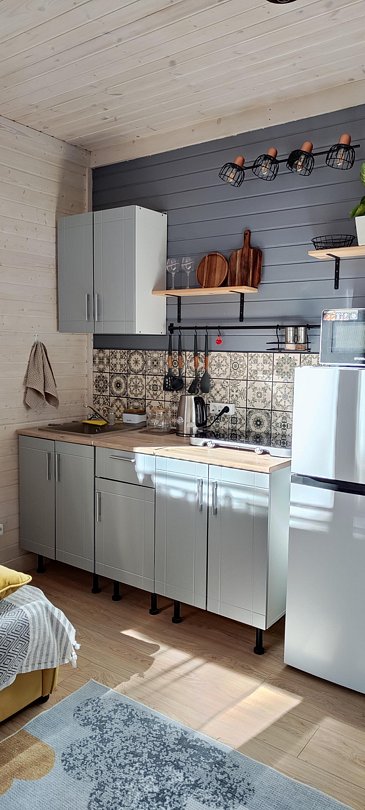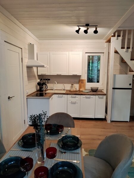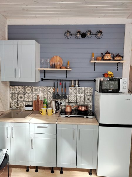 В доме отдельная спальная комната и кухня-гостиная с двуспальным диваном. Полностью оборудованная все необходимой посудой и бытовой техникой кухня.