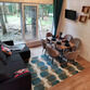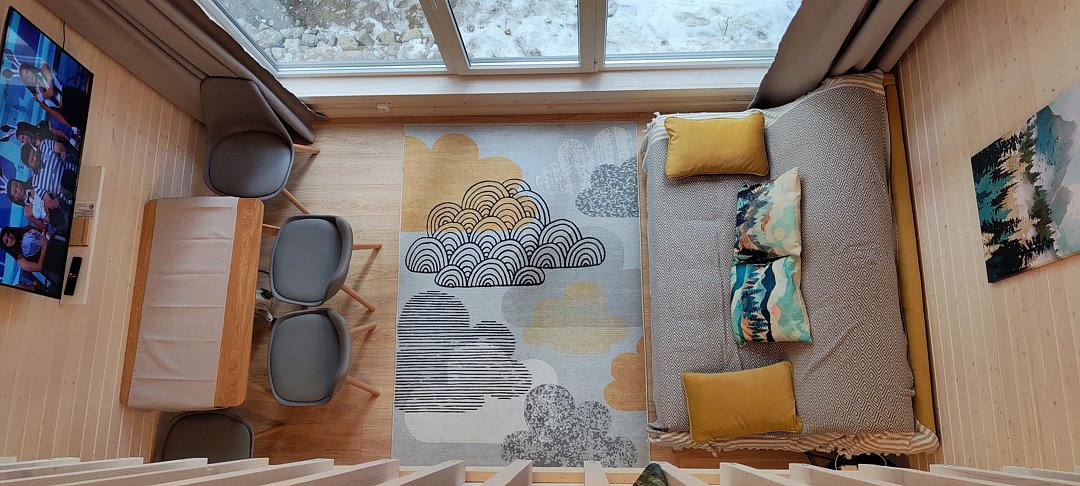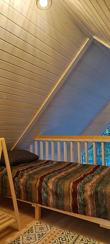 В доме просторная кухня-гостиная с двуспальным диваном, антресоль с двуспальной кроватью и две отдельные спальные комнаты.