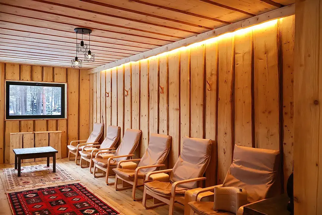 Инфраструктура: купель, зона отдыха, душШикарная баня в кедровой отделке где звучание тибетской флейты после парения уносит тебя далеко и надолго, а ледяная купель на улице будет отличным дополнением после парения!