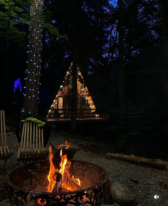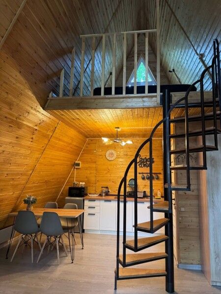 Дом А-фрейм рассчитан на шесть человек. Спальные места: раскладной диван и двуспальная кровать с ортопедическим матрасом.