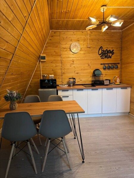 Обеденная зона и полноценная кухня с холодильником, индукционной плитой, микроволновой печью. Полноценный набор посуды на шесть персон и всё необходимое для готовки.