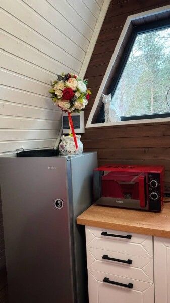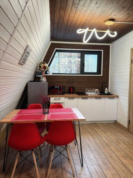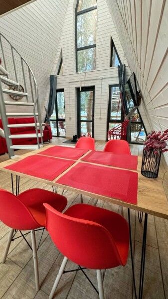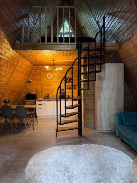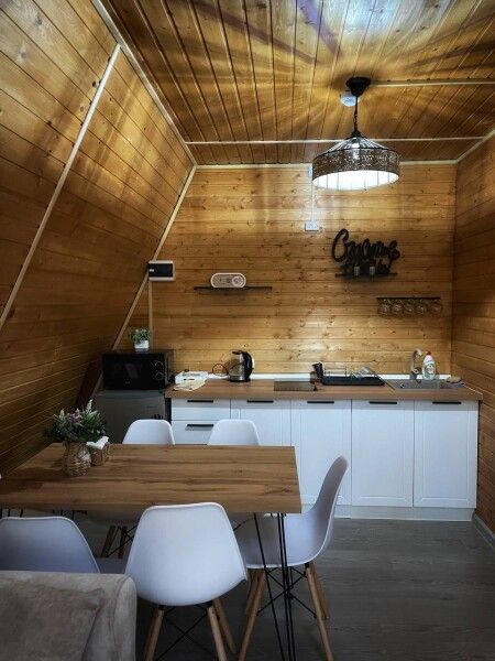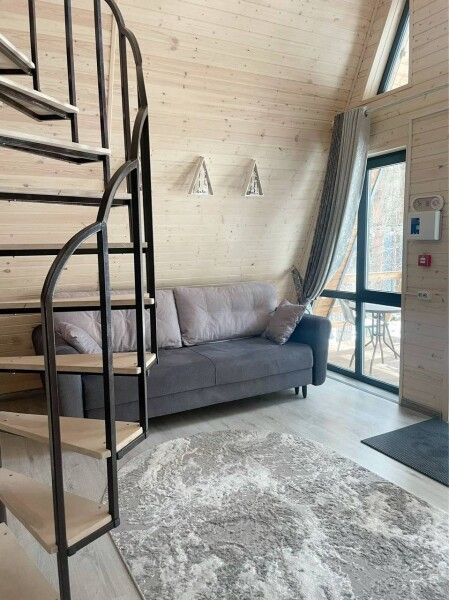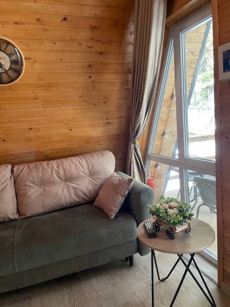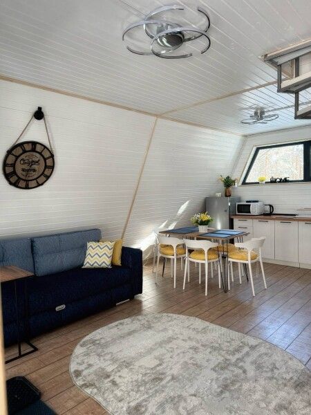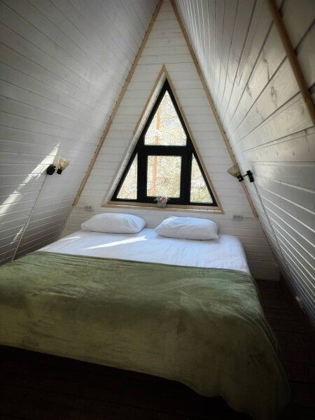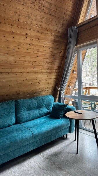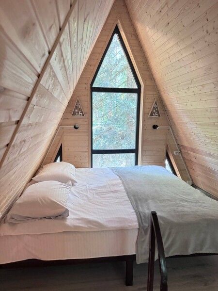Дом А-фрейм рассчитан на четырех-шести человек. Спальные места: раскладной диван и двуспальная кровать с ортопедическим матрасом.