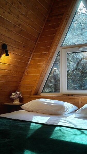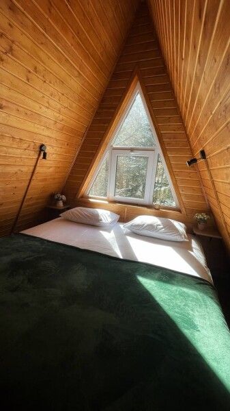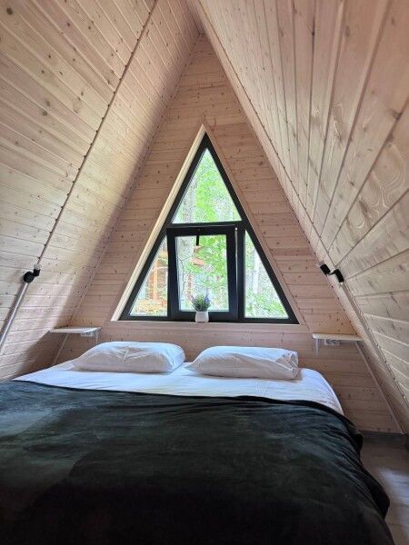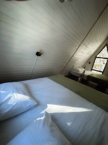Дом А-фрейм рассчитан на четырех человек. Спальные места: раскладной диван и двуспальная кровать с ортопедическим матрасом.