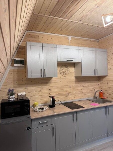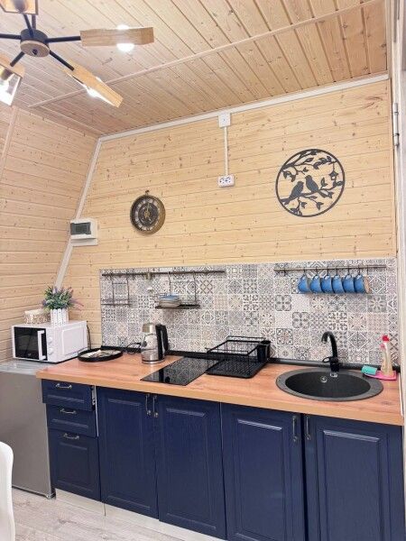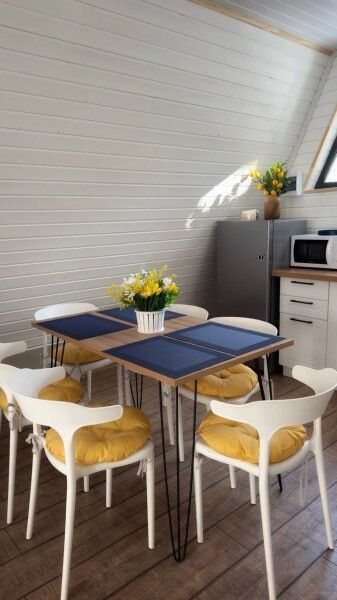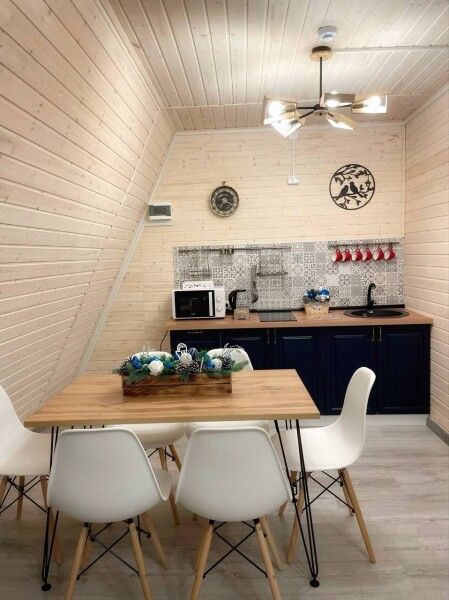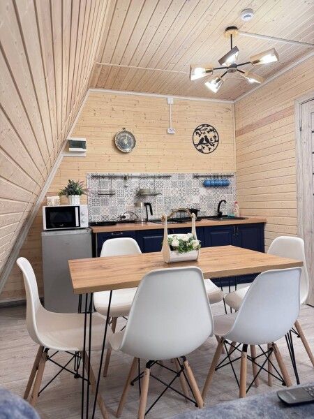 Обеденная зона и полноценная кухня с холодильником, индукционной плитой, микроволновой печью. Полноценный набор посуды на шесть персон и все необходимое для готовки.