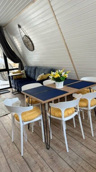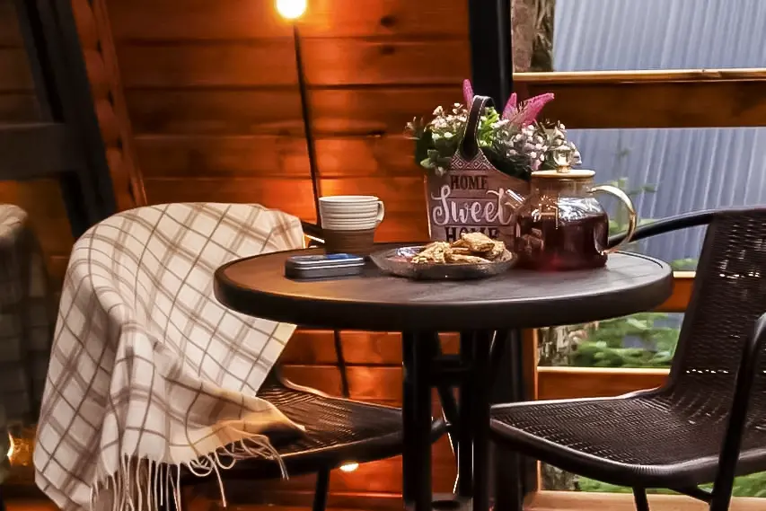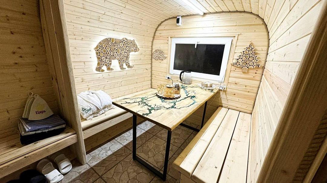 Для тех, кто хочет продлить удовольствие, предусмотрена уютная комната для отдыха с большим столом и удобными скамейками, где можно насладиться ароматным горным чаем из изысканного чайного набора. Гости могут заранее забронировать баню или воспользоваться этой услугой по прибытии в любое удобное для них время.