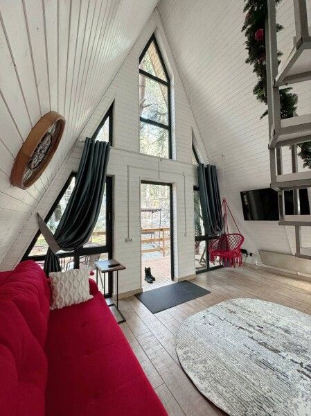 Дом А-фрейм рассчитан на двух-четырех человек. Спальные места: раскладной диван и двуспальная кровать с ортопедическим матрасом.