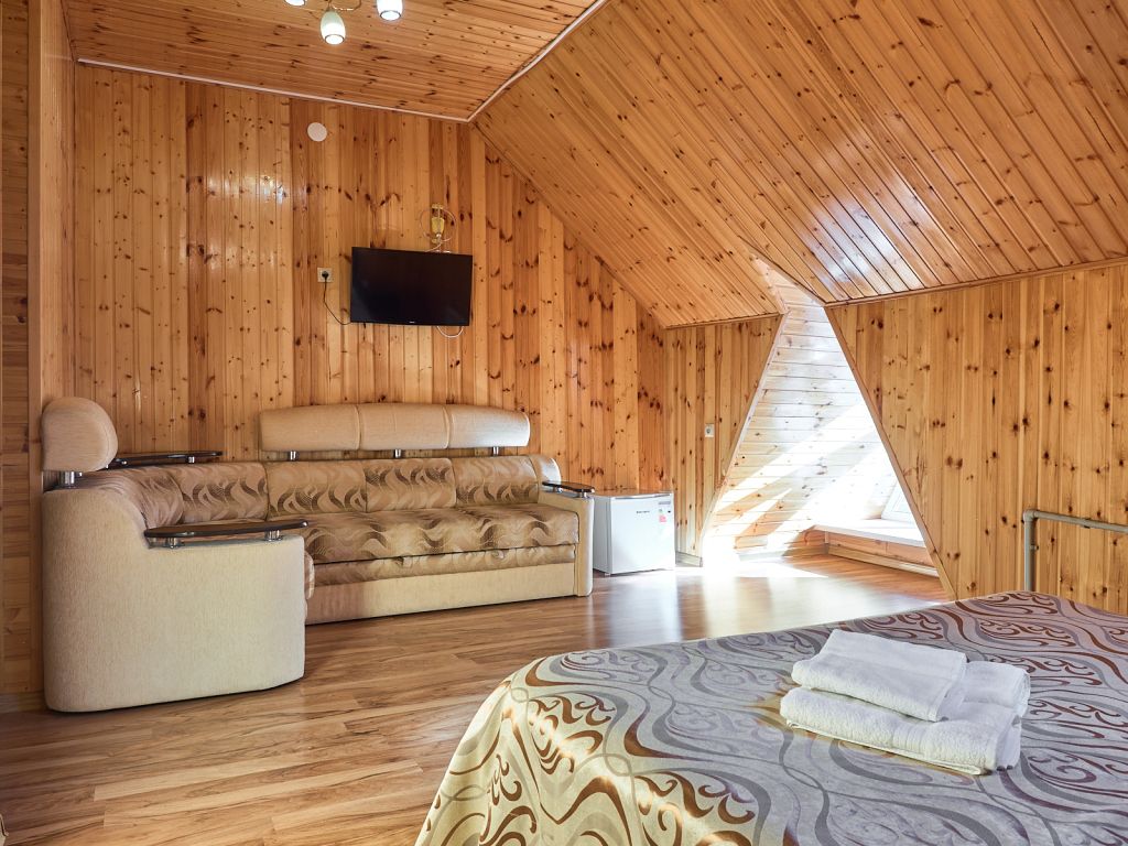 На территории отеля имеется автостоянка под видеонаблюдением, а также русская баня с купелью, мангал, бесплатный доступ в Интернет по средствам Wi–Fi. В шаговой доступности находятся магазины, Сбербанк, канатные дороги.