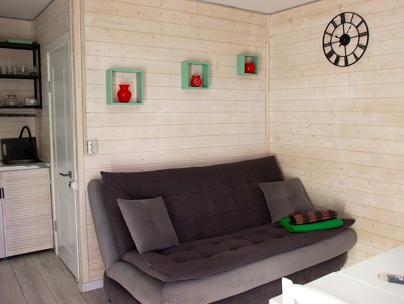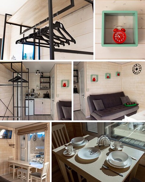 Уютные домики оснащены всем необходимым для комфортного проживания: удобной мебелью, Wi-Fi, кухней, санузлом и техникой.