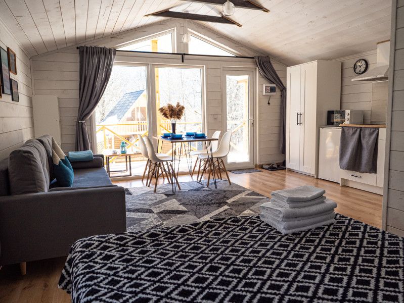 Светлый и стильный коттедж с панорамным остеклением и просторной террасой. Большая комната-студия, в ней двуспальная кровать, раскладной диван, зона кухни, санузел. Дизайн интерьера в скандинавском стиле.