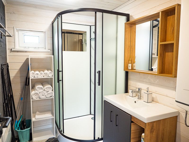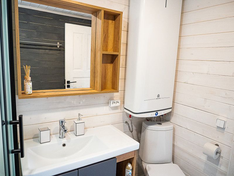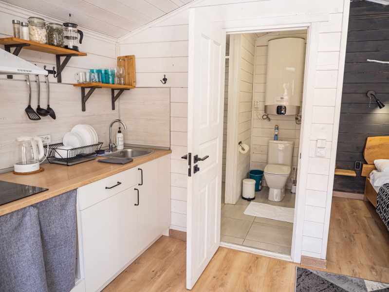 Кухня-гостиная с раскладным диваном и полностью оснащенной кухней. Мансарда на втором этаже с двумя кроватями. Санузел оснащен душевой кабиной, большим водонагревателем, унитазом и большой раковиной с тумбой.