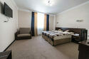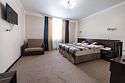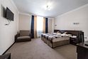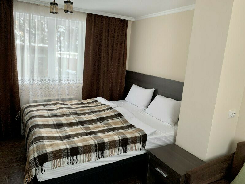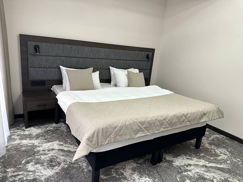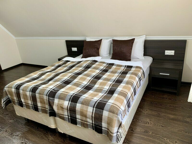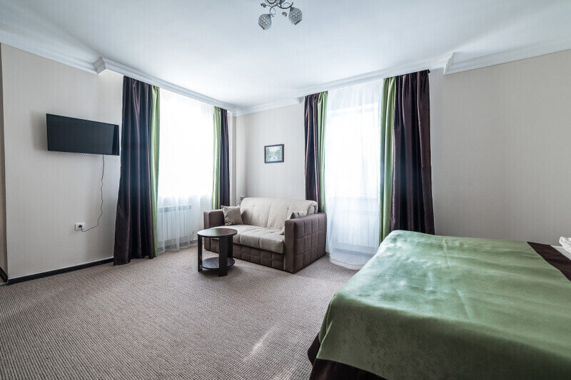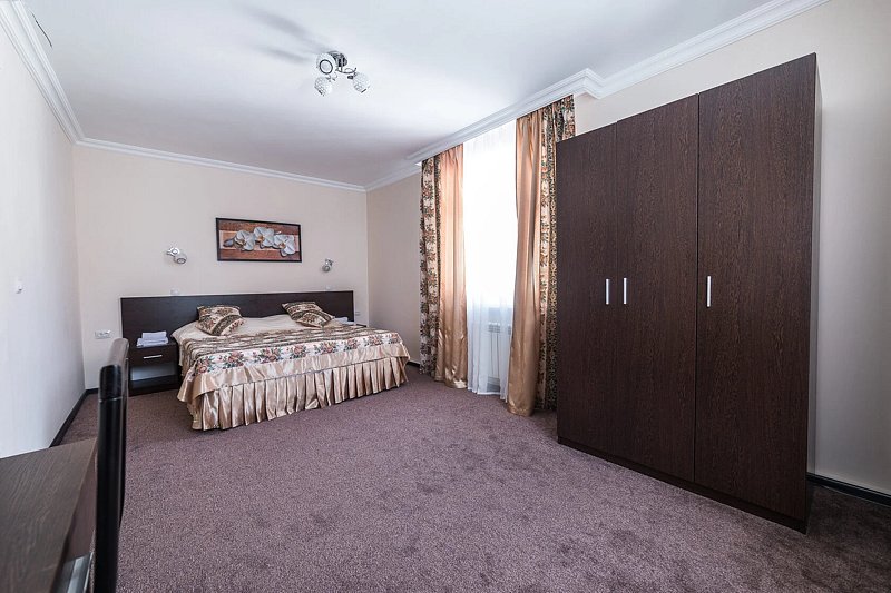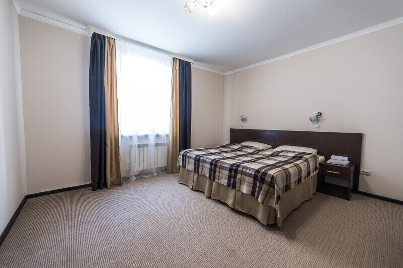Номер категории Стандартный плюс, вмещает троих гостей. В номере большая двуспальная кровать и одноместный раскладной диван, рабочая зона, прикроватные тумбы и дополнительное освещение, душевая, постельное белье, полотенца и фен, современный телевизор с плоским экраном. Зимой включается подогрев полов в душевой. Во всех номерах бесплатный WiFi. На территории отеля имеется Мангальная зона и Русская баня. На первом этаже функционирует кафетерий (питание оплачивается отдельно).