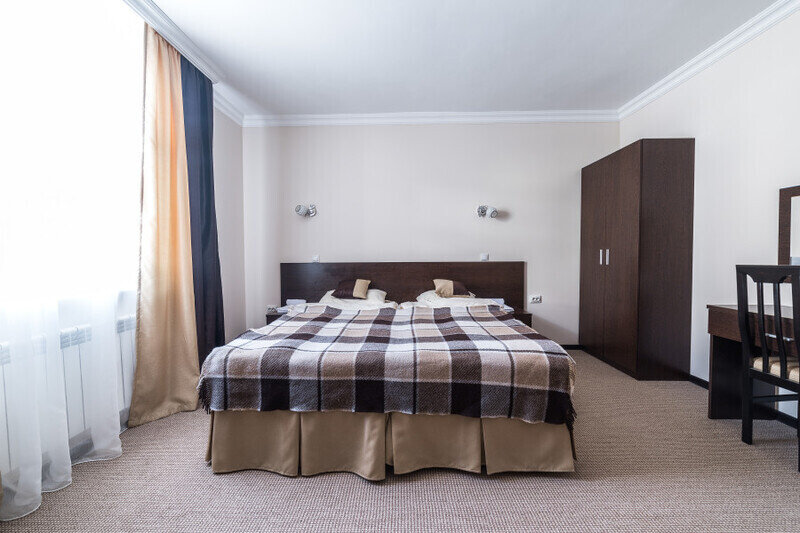 Номер категории Стандартный, вмещает двоих гостей. В номере большая двуспальная кровать, рабочая зона, прикроватные тумбы и дополнительное освещение, душевая, постельное белье, полотенца и фен, современный телевизор с плоским экраном. Зимой включается подогрев полов в душевой. Во всех номерах бесплатный WiFi. На территории отеля имеется Мангальная зона и Русская баня. На территории отеля функционирует кафетерий (питание оплачивается отдельно).