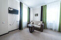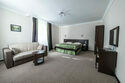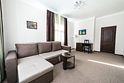 Номер категории Полулюкс, вмещает максимально 4 гостей. В номере большая двуспальная кровать и двухместный раскладной диван, рабочая зона, прикроватные тумбы и дополнительное освещение, душевая, постельное белье, полотенца и фен, современный телевизор с плоским экраном. Зимой включается подогрев полов в душевой. Во всех номерах бесплатный WiFi. На территории отеля имеется Мангальная зона и Русская баня. На первом этаже функционирует кафетерий (питание оплачивается отдельно).