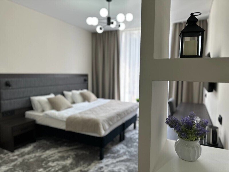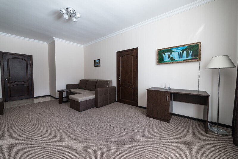 Номер категории Люкс двухкомнатный, вмещает максимально четверых гостей. В номере большая двуспальная кровать, рабочая зона, прикроватные тумбы и дополнительное освещение, душевая, постельное белье, полотенца и фен, современный телевизор с плоским экраном. Зимой включается подогрев полов в душевой. Во всех номерах бесплатный WiFi. На территории отеля имеется Мангальная зона и Русская баня. На первом этаже функционирует кафетерий (питание оплачивается отдельно).