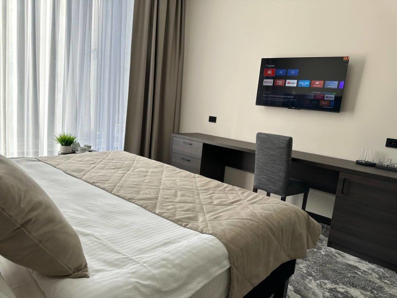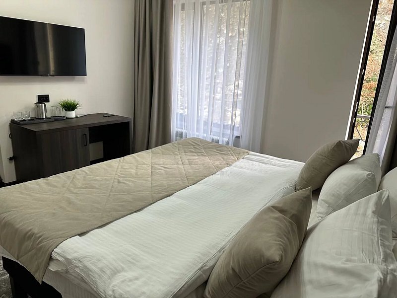 Новый корпус, введен в строй в 2023 году. Номер Делюкс представляет панорамный вид на горы в окне на всю стену. В каждом номере своя душевая и необходимая мебель.