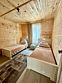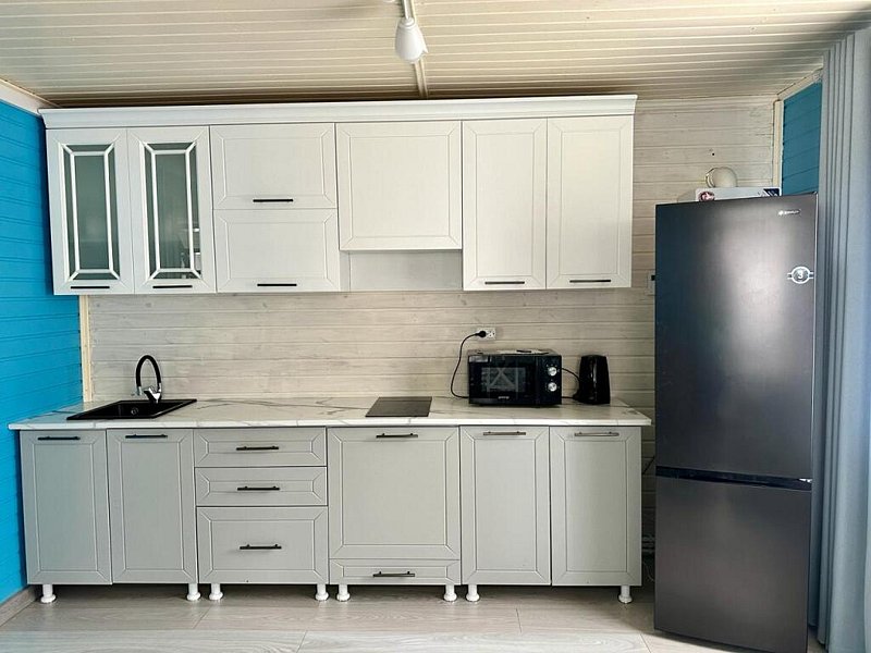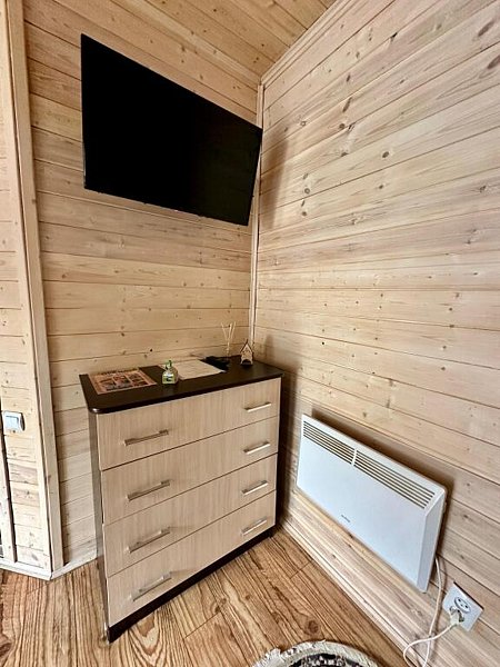 Рассчитан на проживание до 4 человек, имеет две отдельные комнаты, где одна из комнат располагает двуспальной кроватью, другая раздельными односпальными кроватями, в количестве 2 шт. Общая кухня гостиная с выходом на террасу. На террасе в вашем распоряжении садовая мебель (стол+4 стула) и кресло-кокон. Внутри дома есть все необходимое для комфортного проживания. Кухня включает в себя индукционную плиту, холодильник, микроволновую печь, посуду и принадлежности для приготовления пищи. В зоне гостиной расположен диван и ТВ с доступом в интернет. Бесплатный WiFi на всей территории. Также в коттедже совмещённый санузел с душем и туалетом.