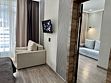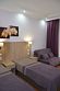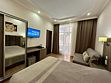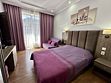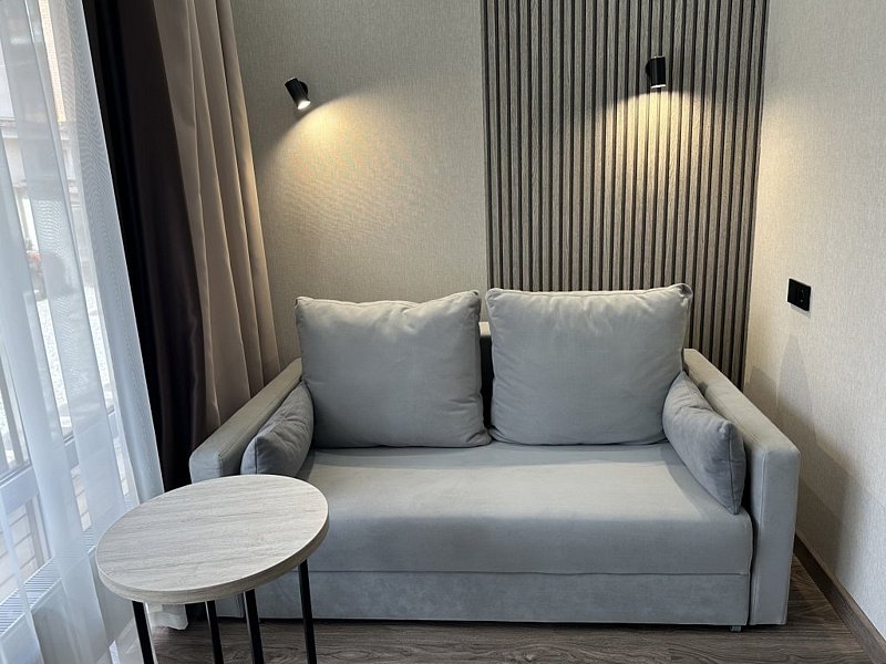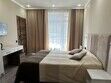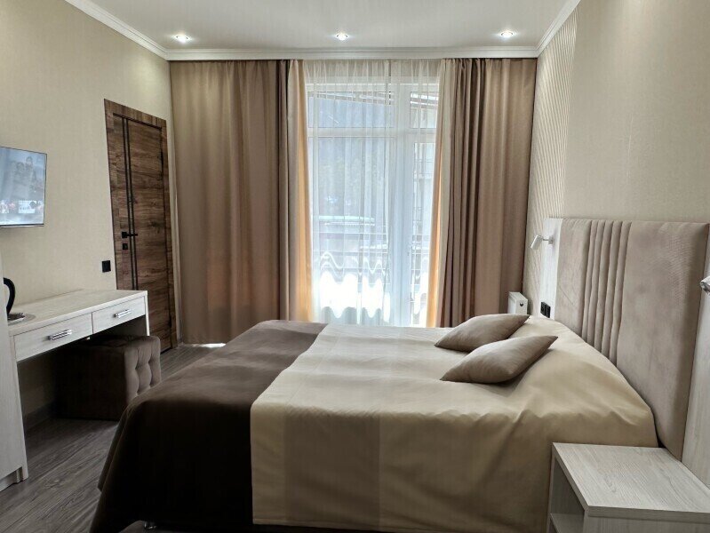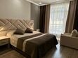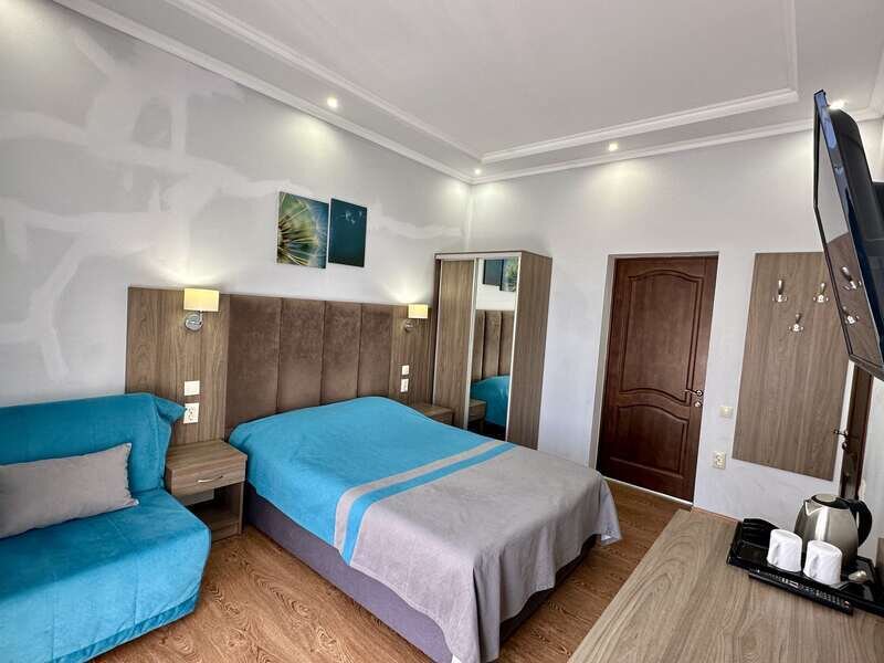 Комната оборудована всем необходимым. Имеется двуспальная кровать, диван, в комнате своя ванная комната