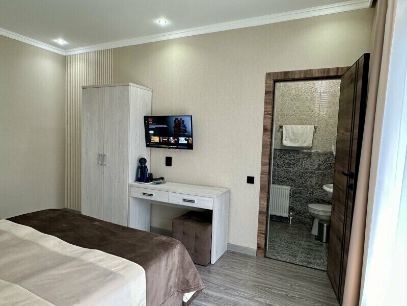 Комната оборудована всем необходимым. Имеется двуспальная кровать, в комнате своя ванная комната