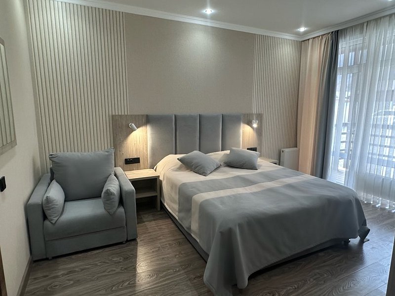 Комната оборудована всем необходимым. Имеется ддвуспальная кровать и кресло, в комнате своя ванная комната