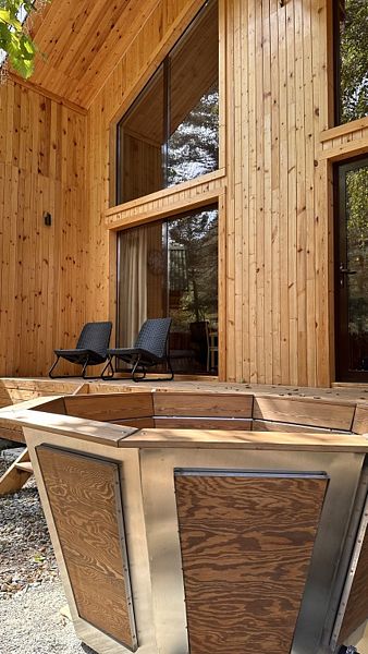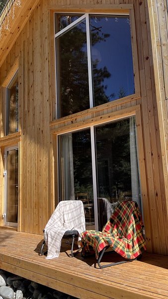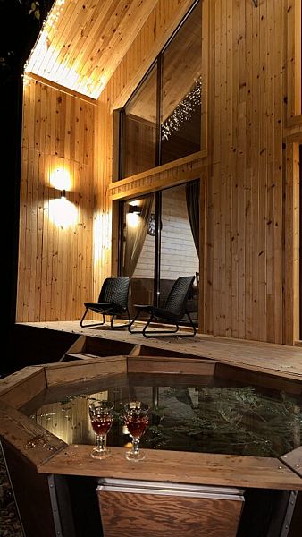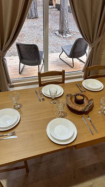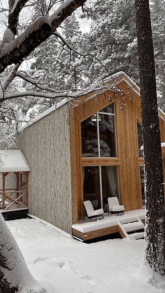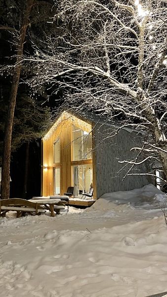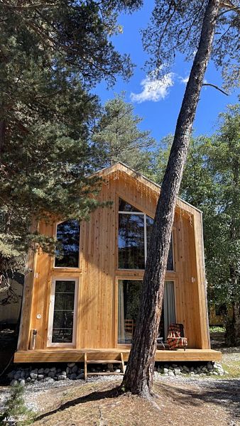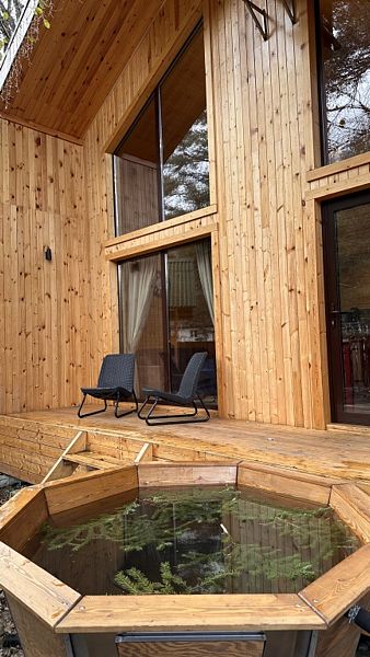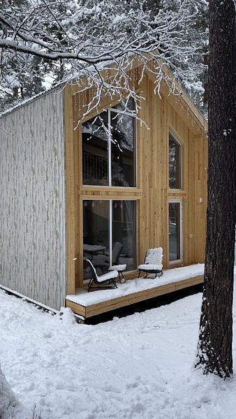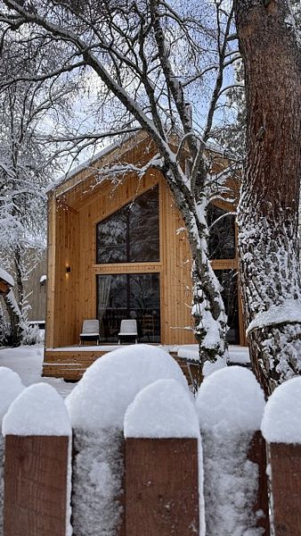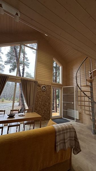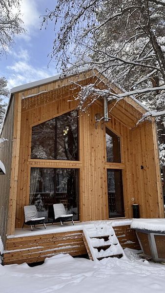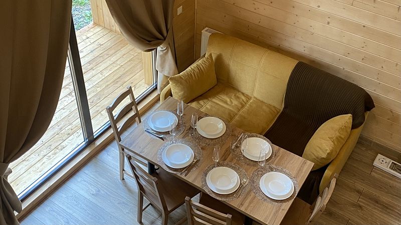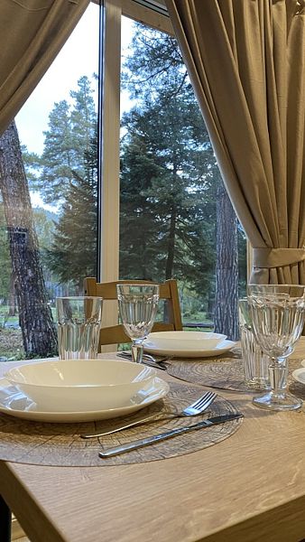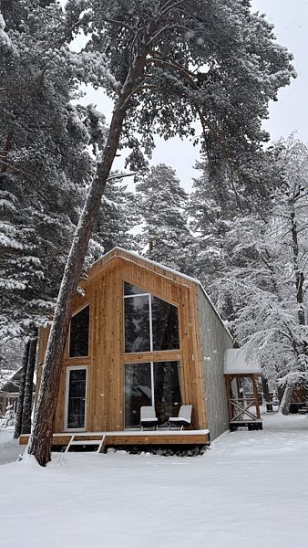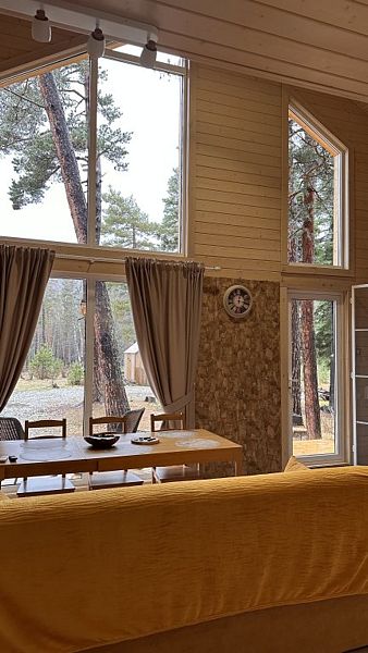 Будучи расположенными в глубине соснового бора у реки Софии, домики предлагают гостям атмосферу настоящего загородного отдыха и красивый вид, открывающийся из панорамных окон.