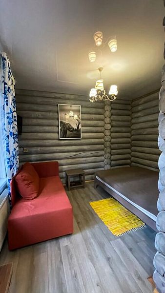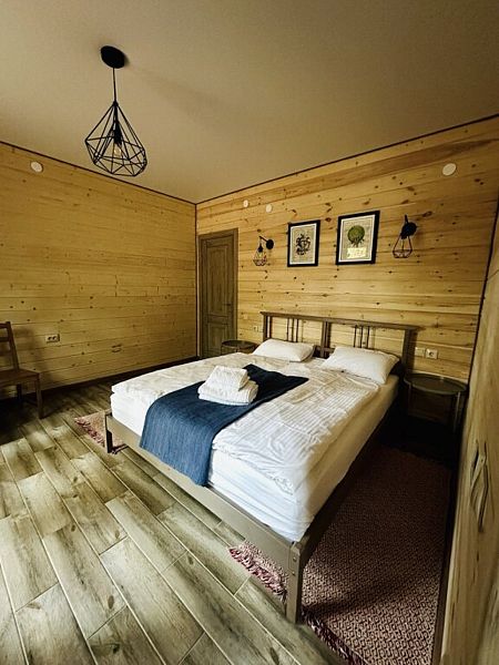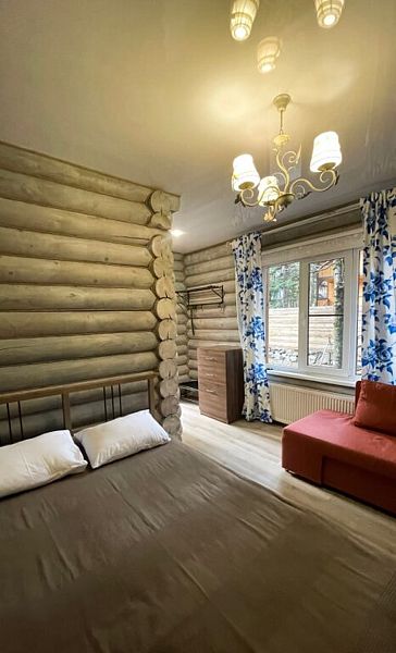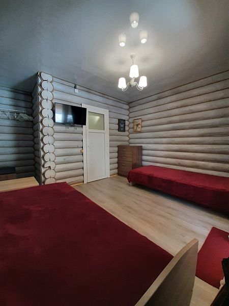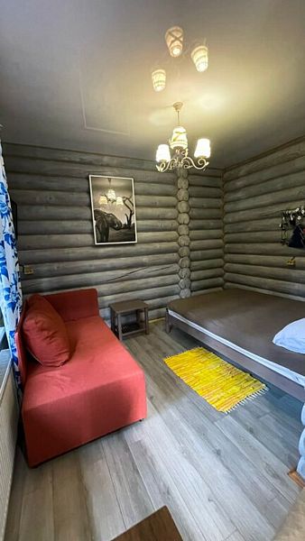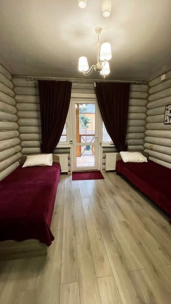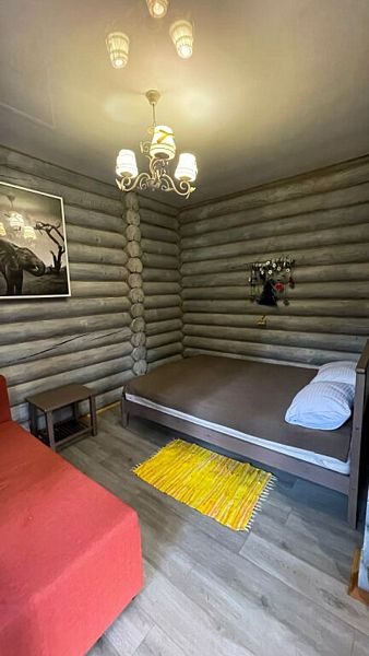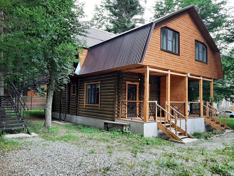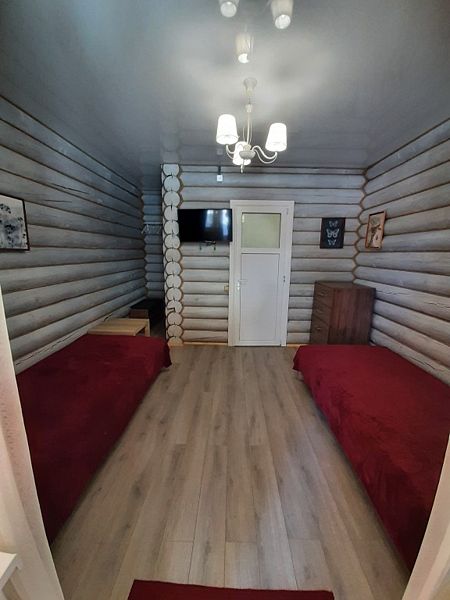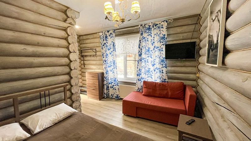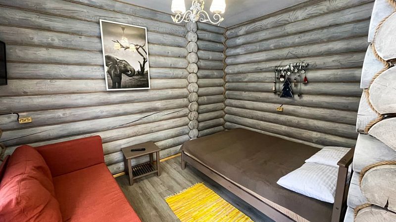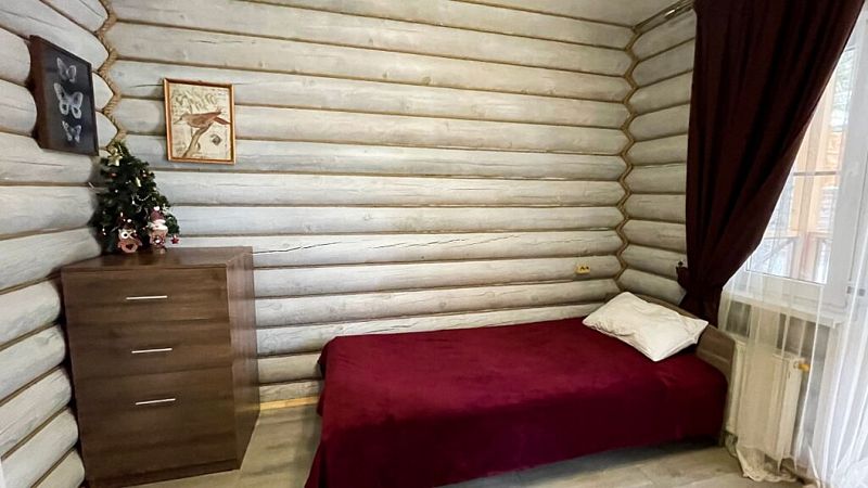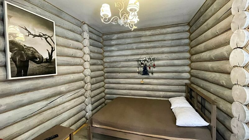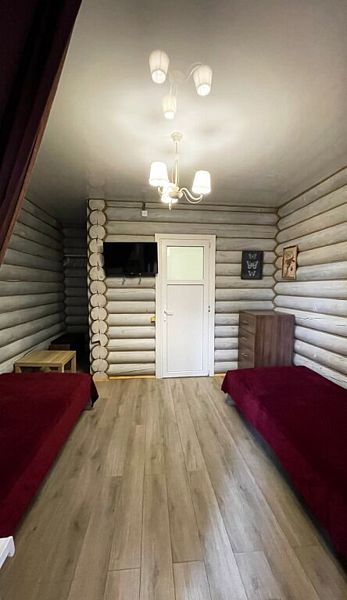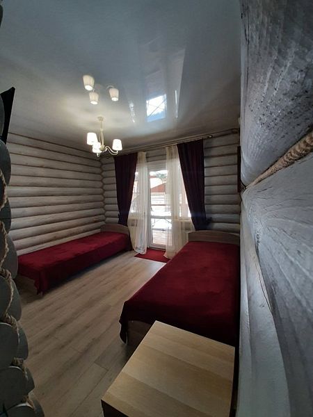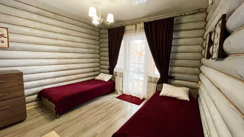 В двухэтажном доме из сруба 5 номеров и общая кухня.
